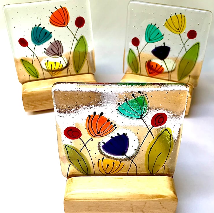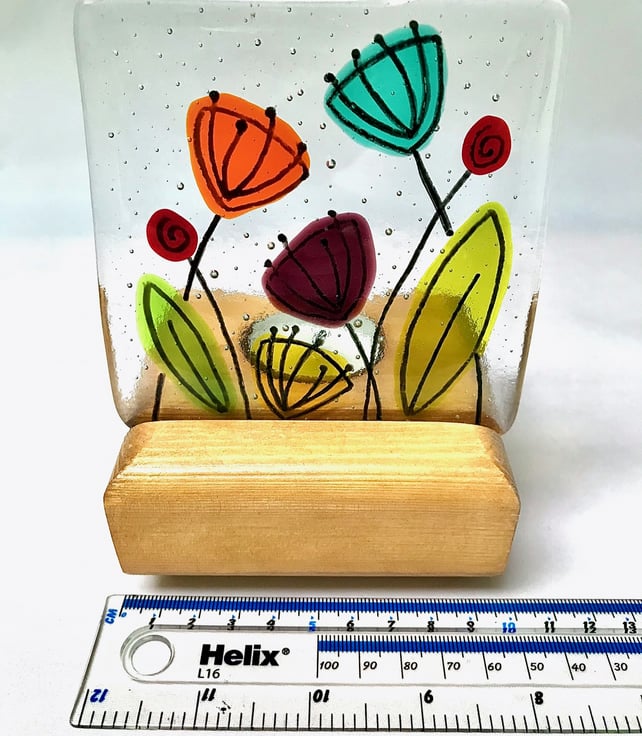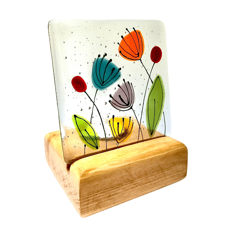 Measuring approximately 10.4m x 10.4cm this vibrant floral dandelion glass panel has been made from individually cut pieces of coloured glass placed on a clear base and slowly fused at 800 degrees Celsius. It was then hand painted with glass paint and refired to add the decorative outline features. It stands in a handmade redwood stand (10cm x 10cm x 4cm), with a recess behind to hold a tealight to make the colours glow in the candle light.