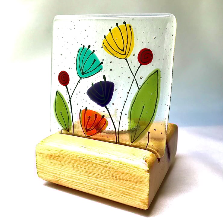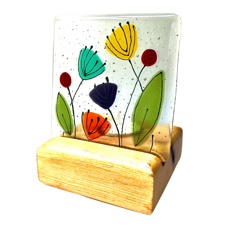 Measuring approximately 10.4m x 10.4cm this vibrant floral dandelion glass panel has been made from individually cut pieces of coloured glass placed on a clear base and slowly fused at 800 degrees Celsius. It was then hand painted with glass paint and refired to add the decorative outline features. It stands in a handmade redwood stand (10cm x 10cm x 4cm), with a recess behind to hold a tealight to make the colours glow in the candle light.