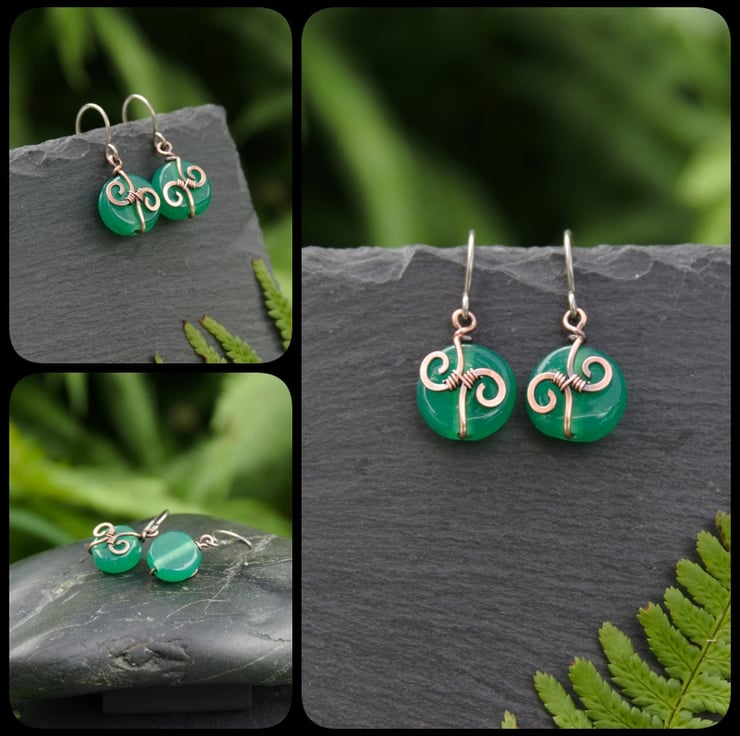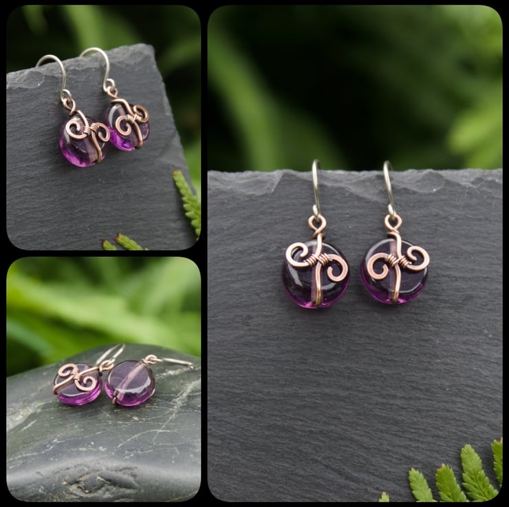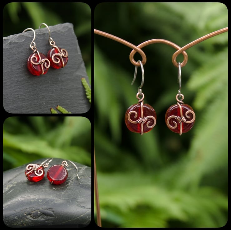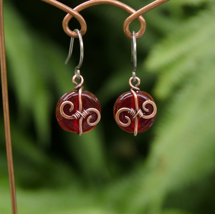 These sweet little drop earrings feature glass disc beads in a range of colours. Each earring has been made with a single length of copper wire, finished with opposing swirls on the front of the bead. These swirls have been hammered flat and then lashed together with fine wire to secure. These cute dangle earrings are lightweight and perfect for everyday wear, with a range of colours to match any outfit!