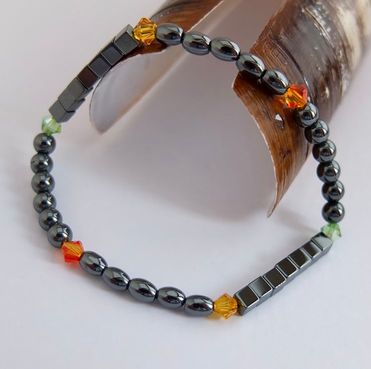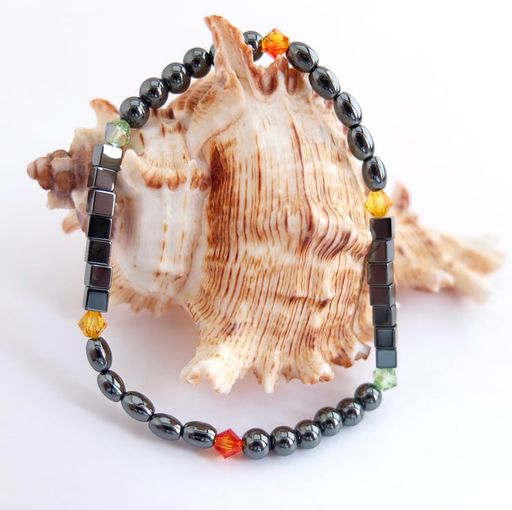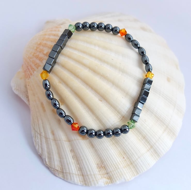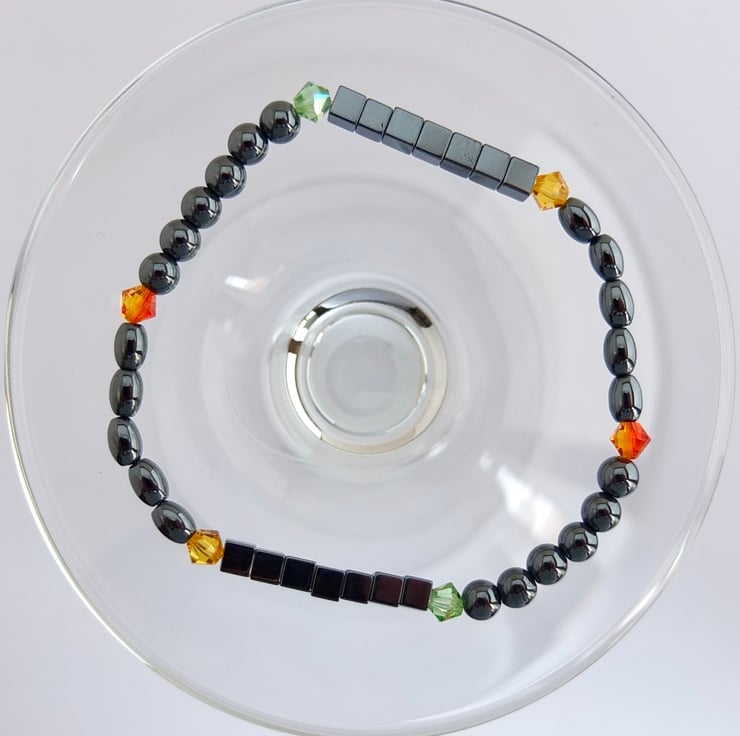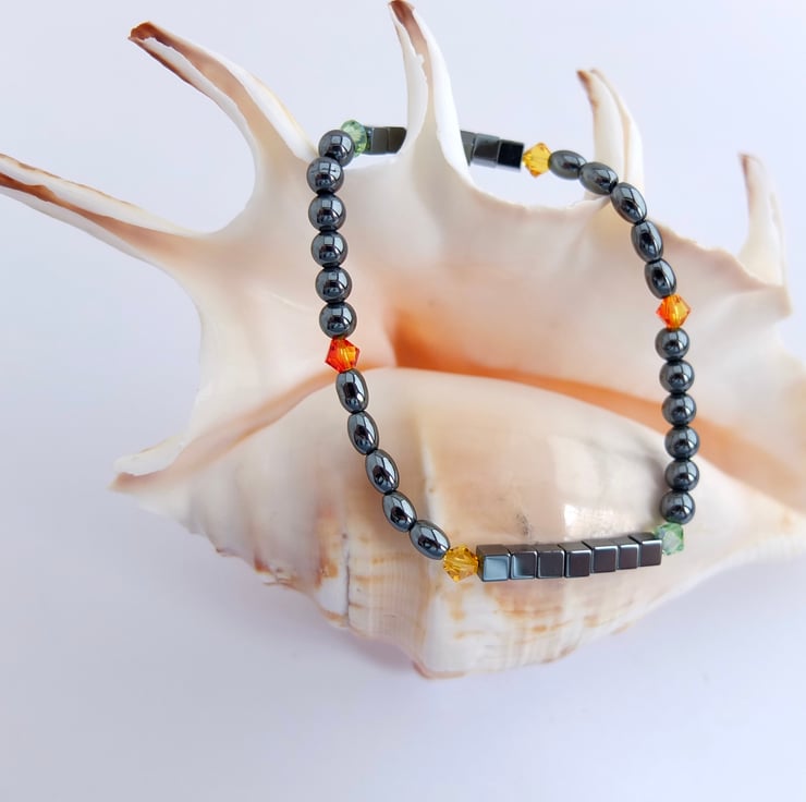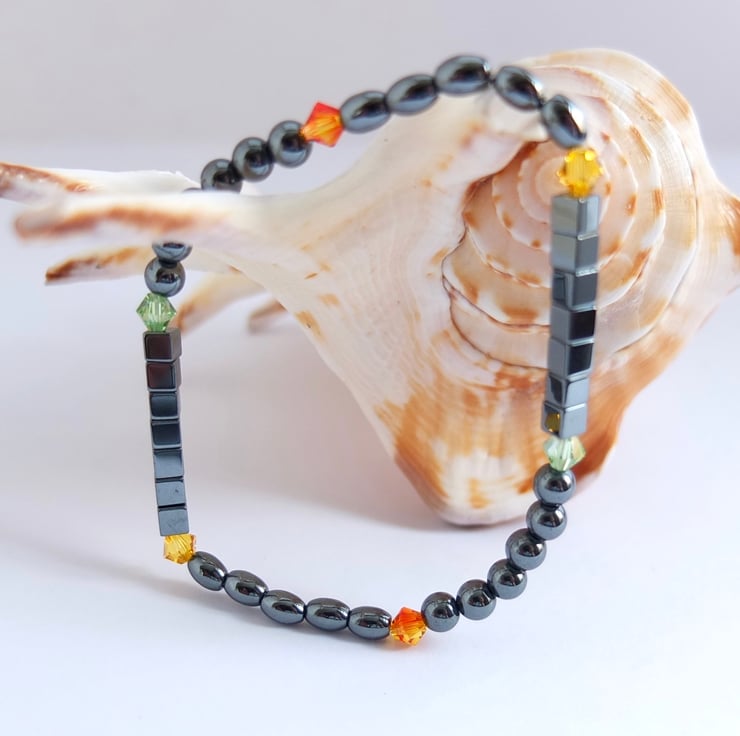 Hematite cubes, ovals and rounds are interspersed with bright and sparkly Swarovski crystals in colours called "peridot", "sunflower" and "fireopal".