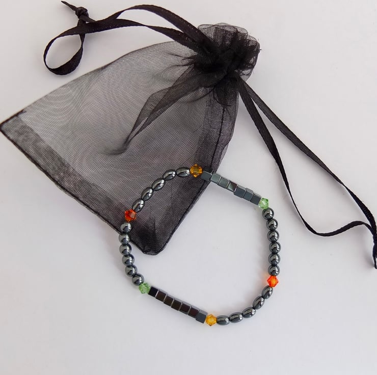 This bracelet incorporates the colours for the first four chakras - root (black), sacral (orange), solar plexus (yellow) and heart (green).