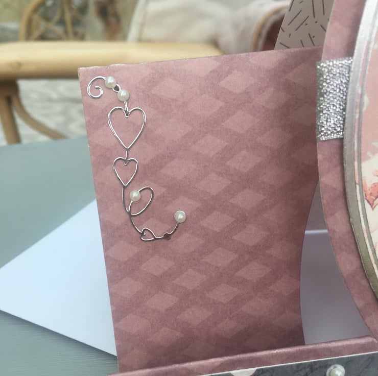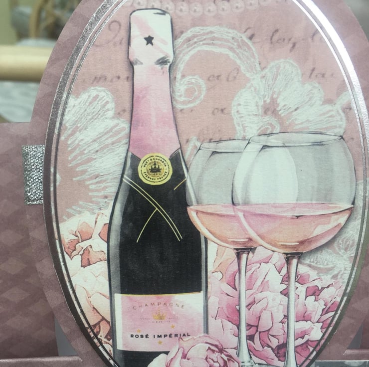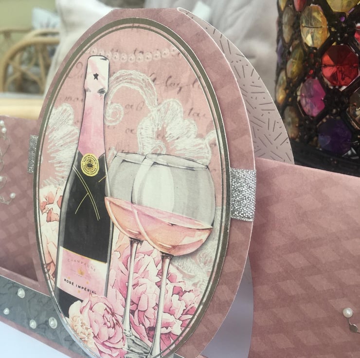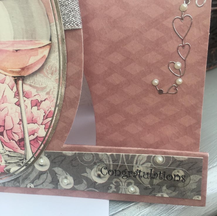 An unusual and thoroughly pink congratulations card. This approximately A5 sized card is a stepper design with an oval centre. The main card is a dusky pink checkerboard design. This is topped with an oval design that features a bottle of pink bubbly and 2 glasses. The background is of embroidered flowers, pearls and roses. The bottom of the card has a grey piece of card with swirls, pearl and script on it. The greeting is a simple one and says 'Congratulations'. The 2 side panels have silver heart swirl designs. There is a strip of silver sparkly ribbon under the topper. The card is sprinkled with faux pearls. It is versatile enough to be used for a birthday, anniversay or even a same sex engagement or wedding.