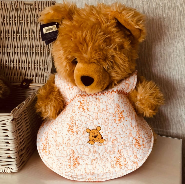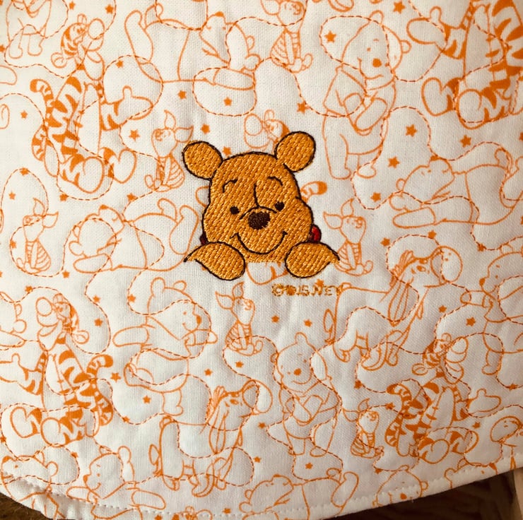 I have machine embroidered the Winnie the Pooh design and quilted the front onto this gorgeous Pooh Bear & Tigger cotton fabric and then sewn it on my sewing machine.
