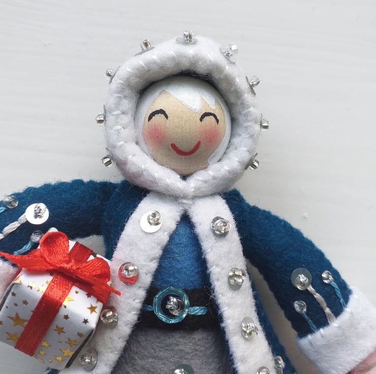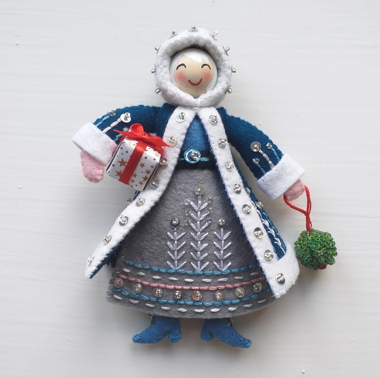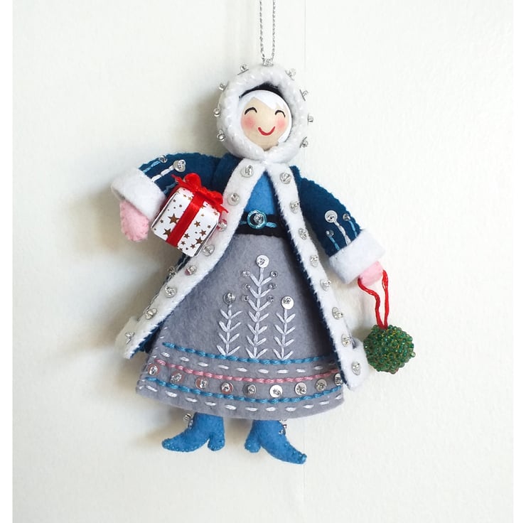 Mrs Claus has been carefully hand sewn and embroidered by me using 100% wool felt and embellished with embroidery, sequins and small glass beads.