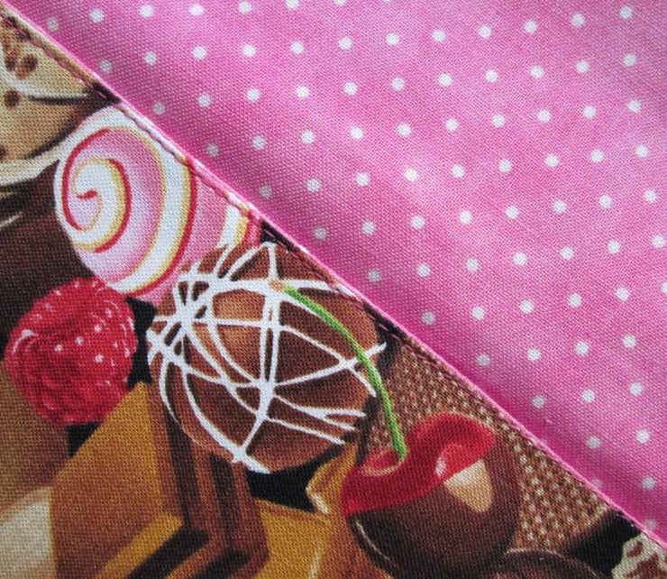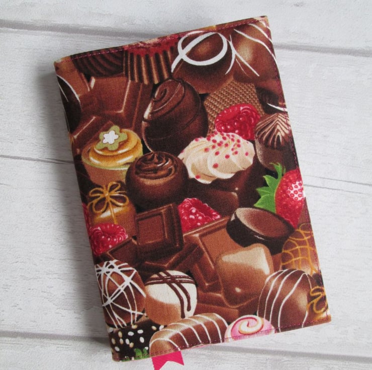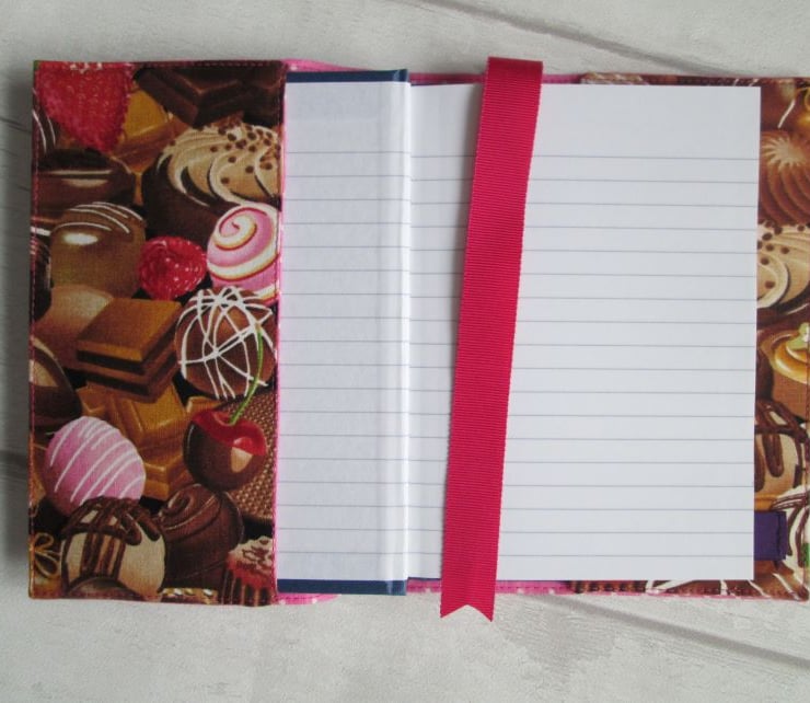 A neat, A6 notebook with a reusable fabric cover in a mouthwatering print of chocolates and fruit. Lined with coordinating, pink spotted cotton and finished with a pink ribbon place marker, it would make a lovely gift for a chocolate lover. Comes complete with a hardback lined notebook.