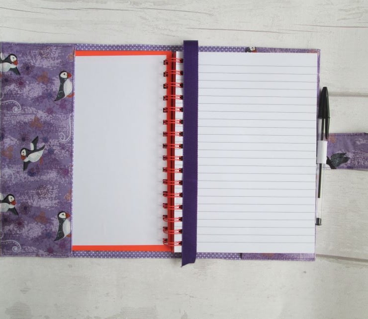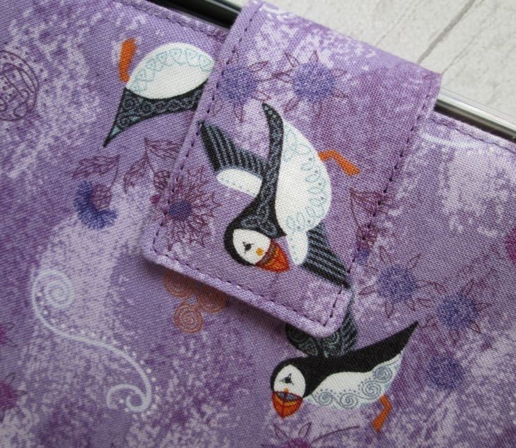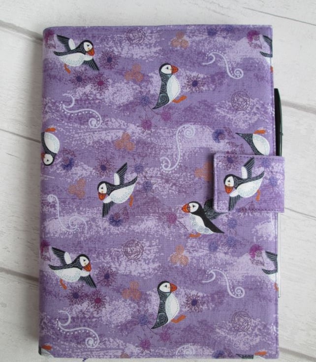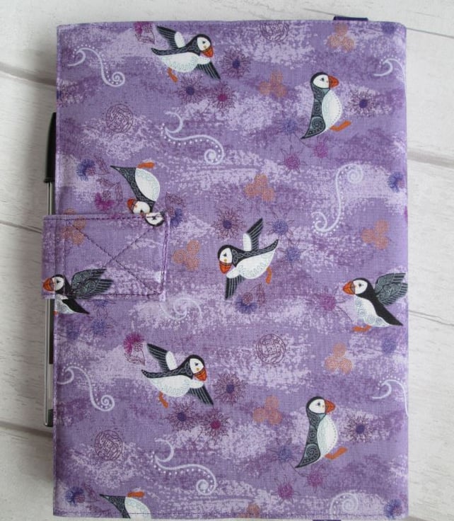 An improbability of puffins (yes really - a group of them can also be a circus, a colony or a puffinry), whatever a group is called, they're such jolly, loveable, little birds. These particular ones are pootling about on a lovely lilac background with thistles, sea holly and some Celtic patterns. The notebook cover is lined with a lilac spotted print and finished with a ribbon place marker, elastic pen holder and magnetic strap fastening. Comes complete with a notebook and pen, ready to use or give.