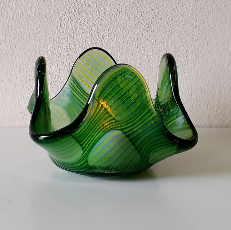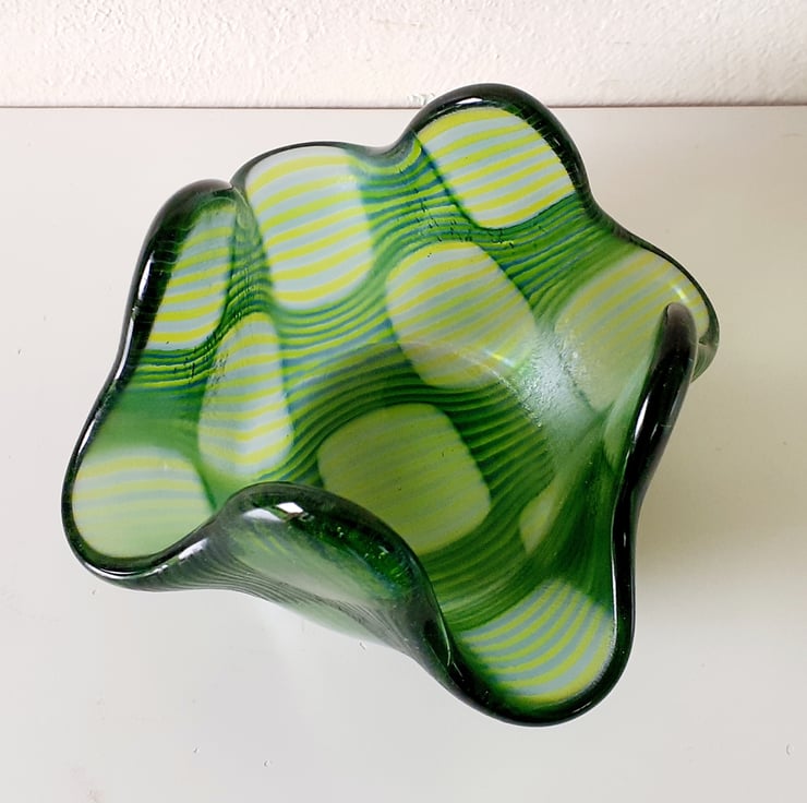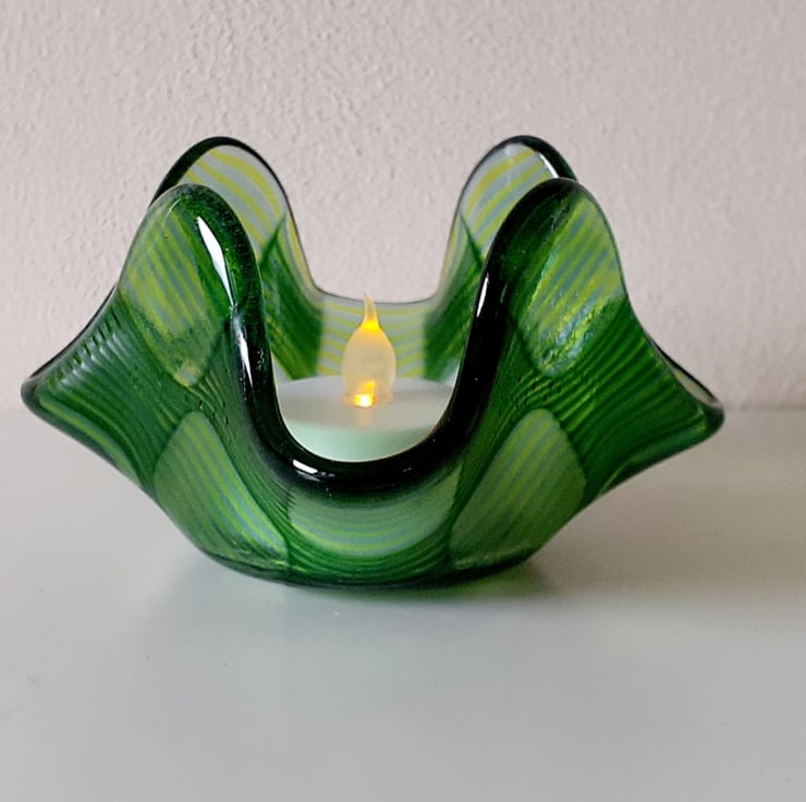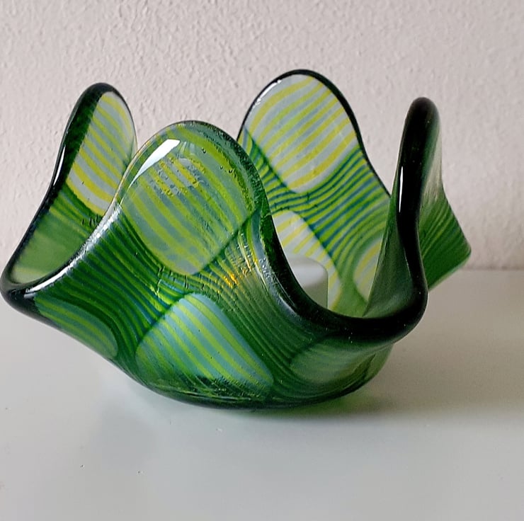 This fused glass candle holder has been created using the 'optic' technique. Dozens of thin glass rods in transparent acid green and soft steel blue have been cut to size and laid out onto a clear glass base, and the optic technique applied, which gives the striking 'bubble' effect and a subtle colour shift to the glass rods in the clear bubble areas. The technique requires time, patience and a very steady hand. The glass elements are fused together in the kiln, and then the resulting blank is fired a second time over a steel former, to give the finished shape.