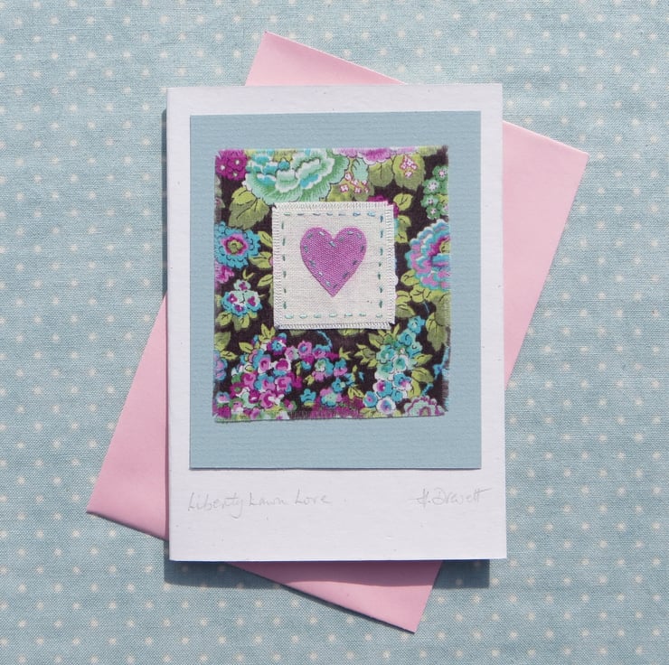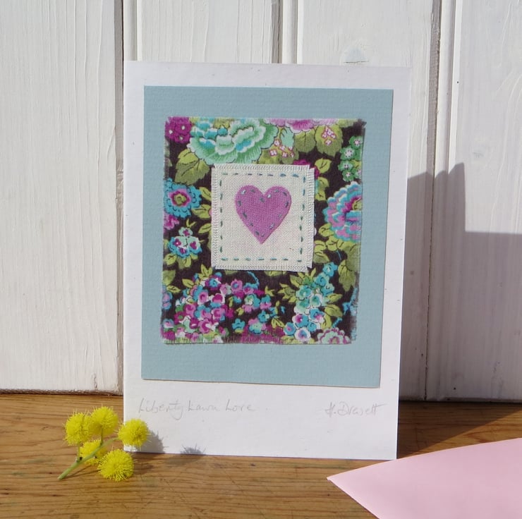 Hand-stitched hand dyed applique heart with cheerful Liberty Tana Lawn cotton print background. Very pretty, perfect for any time when you want to send your love to someone in a special way. The title is: Liberty Lawn Love