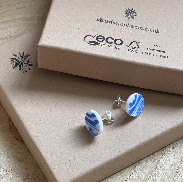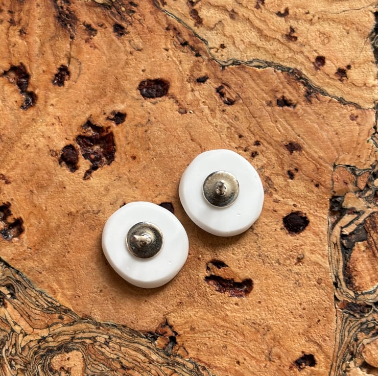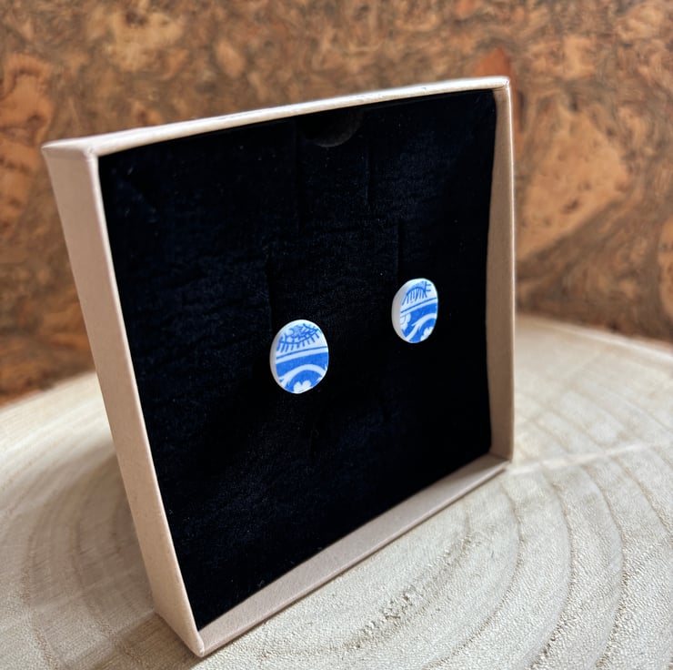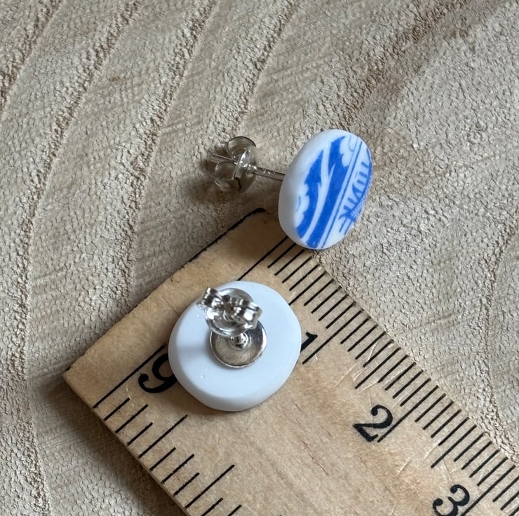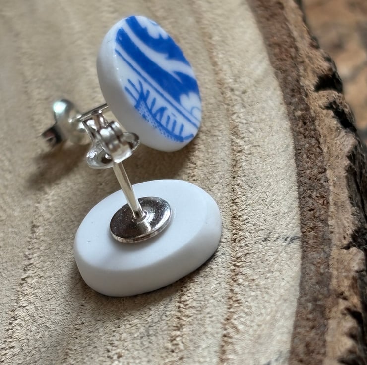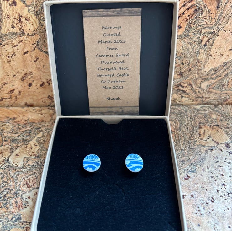 After a thorough clean I managed to create a pair of stud earrings, both show the same part of the pattern but are not exactly alike. Circular but also not exact, this is the nature of the ceramic found. Back and sides smoothed and sealed with Eco Friendly matt sealant.