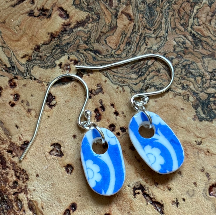 These earrings are made from a small, journey worn shard found face down in the beck. Front glaze intact, sides and back sanded and sealed with eco friendly non toxic matt sealant.