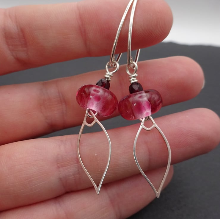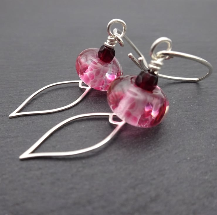 A pair of earrings made using sterling silver ear wires, handmade lampwork glass beads and sterling silver charms.