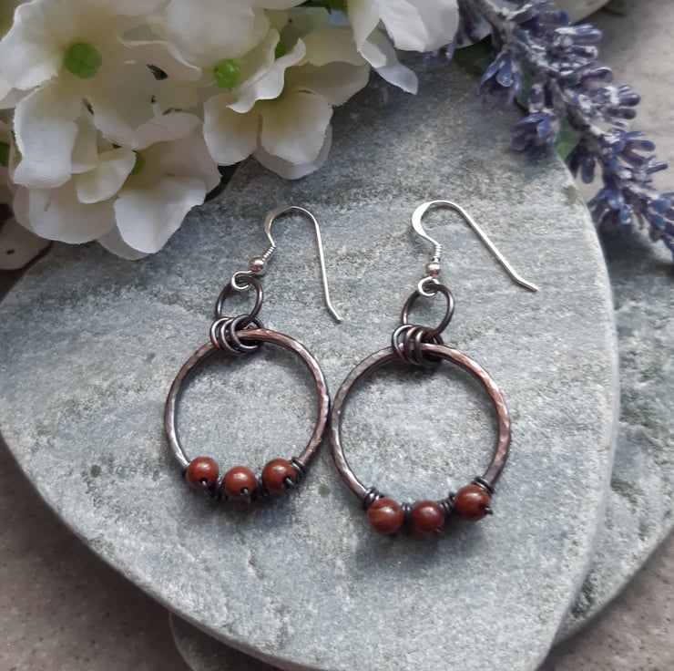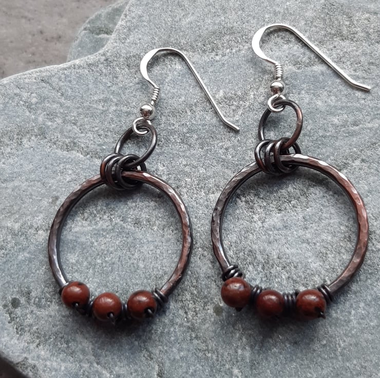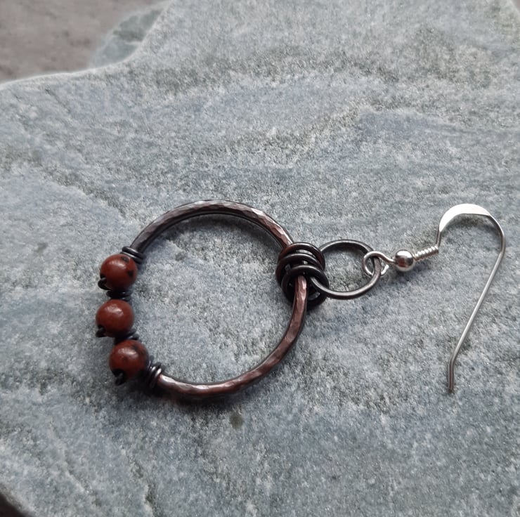 These earrings have been made out of copper wire which has been formed into a circle soldered and hammered to give texture and harden. The wire hoops have then been oxidised to give an aged look .The copper hoops have been attached to sterling silver ear wires. Small mahogany obsidian semi precious gemstones are attached with copper wire.