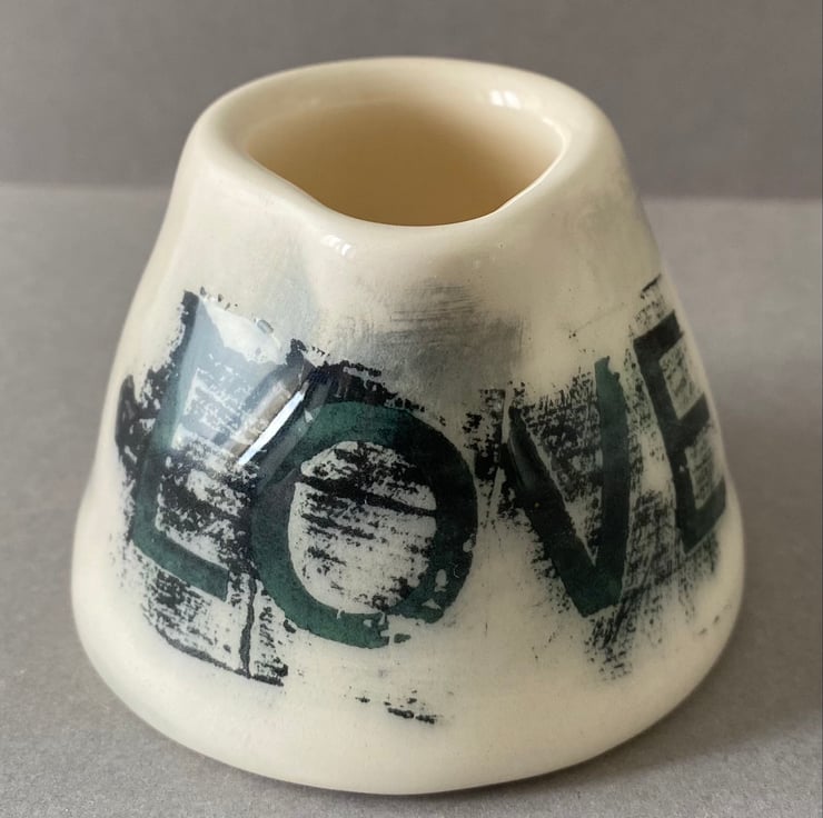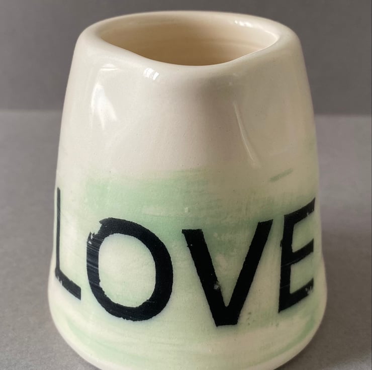 Cream/White earthenware ceramic pourer/jug set. Hand thrown on my little pottery wheel. Dipped in a transparent clear glaze. Each pourer features a handmade, screen printed Love design.