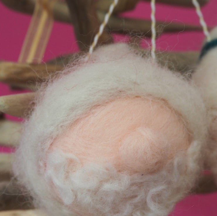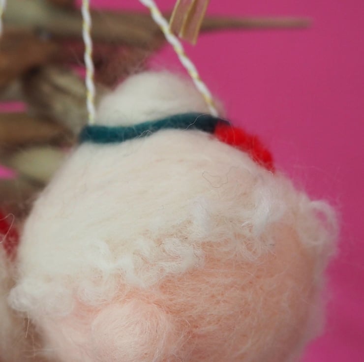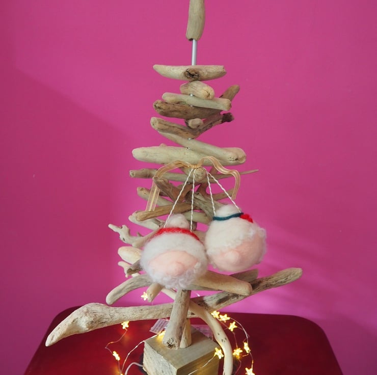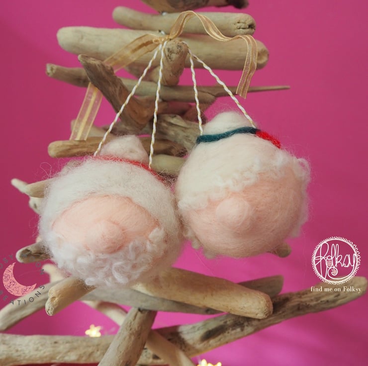 These matching baubles have been handfelted in wool by myself around a light weight ball. They measure approximately 8cm, plus 8cm of gold and cream twine.