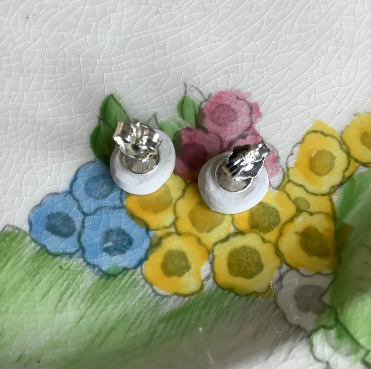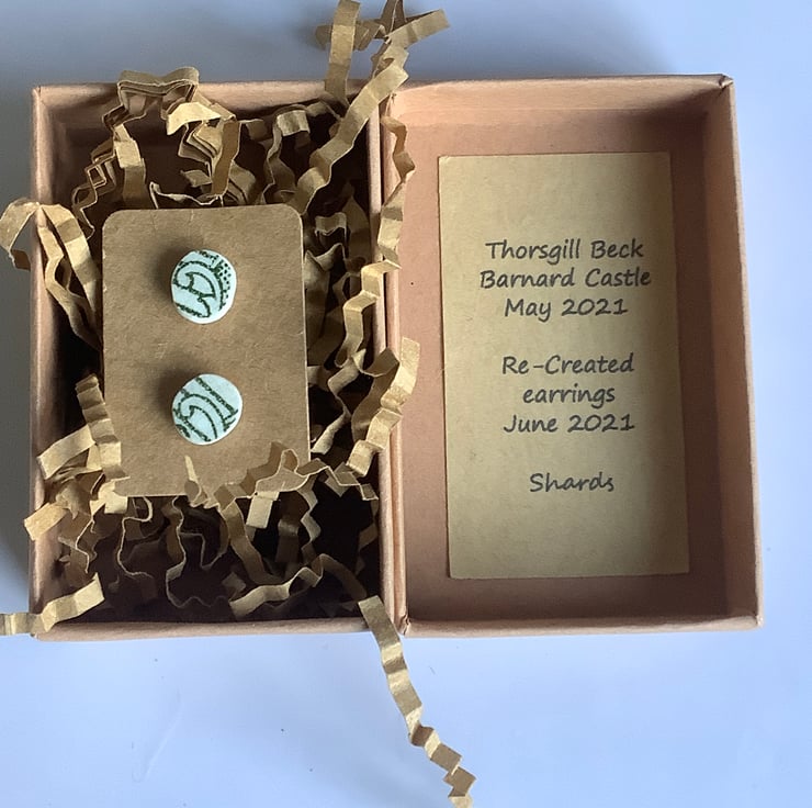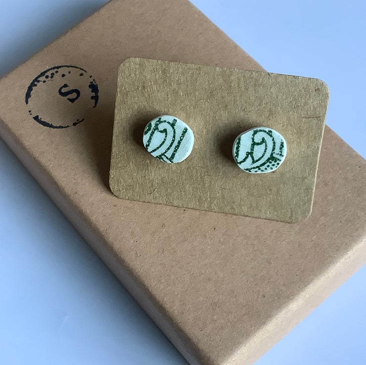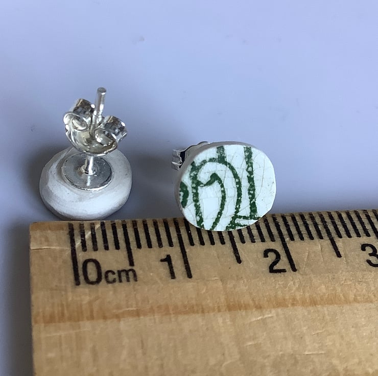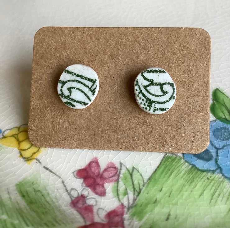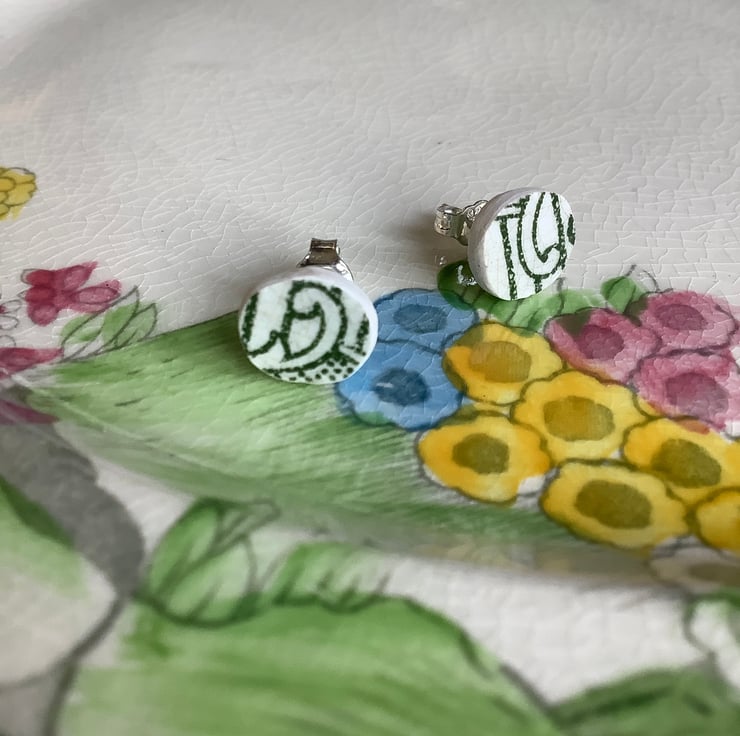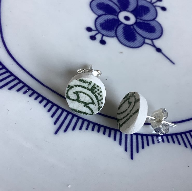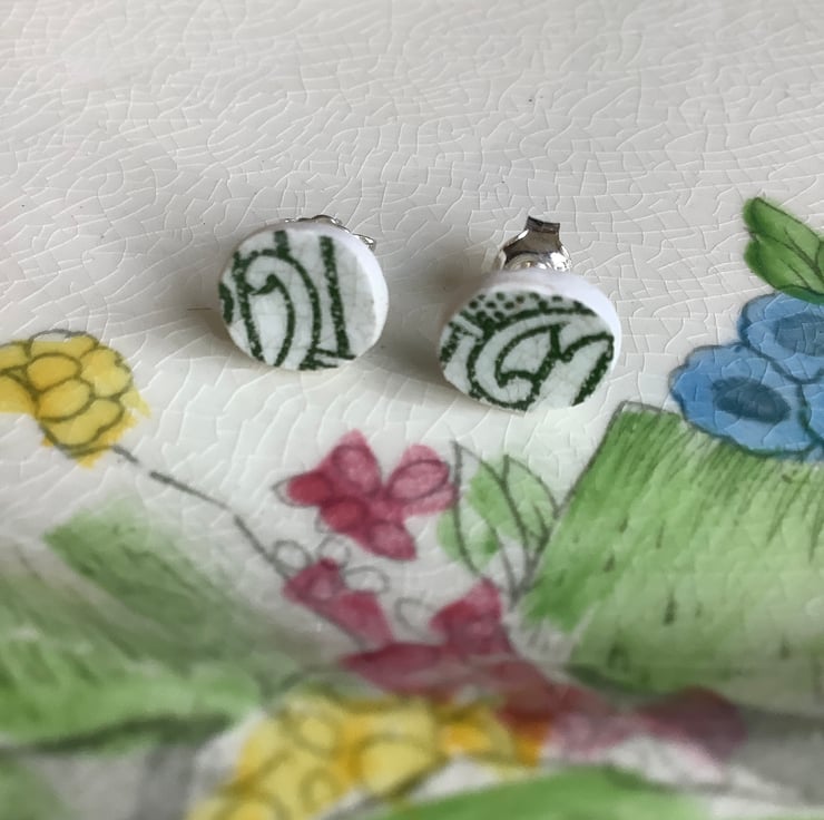 These earrings are made from a chunk of ceramic found under a wooden footbridge, I’ve no idea what the shard came from because there are no tell tale signs and the thickness is even. Lovely green abstract pattern, I only found this one small piece so these earrings are completely unique.