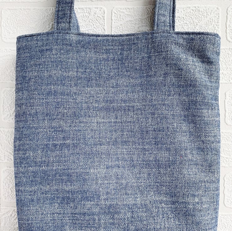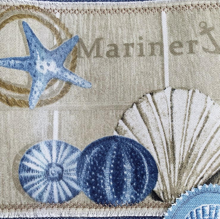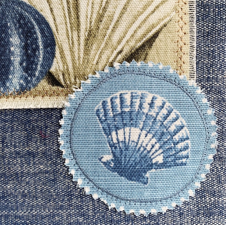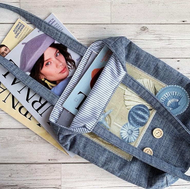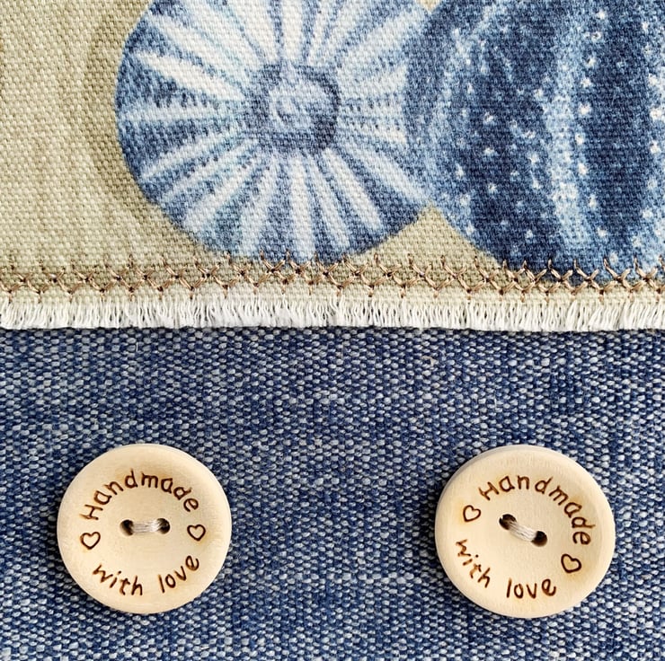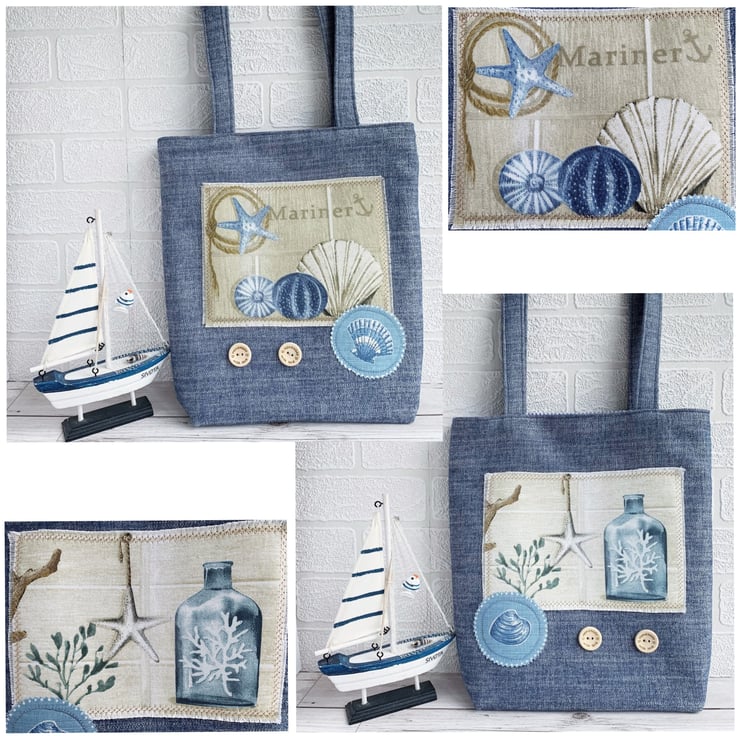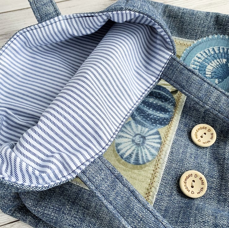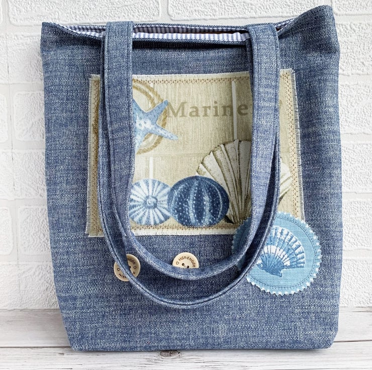 Beachcomber coastal tote bag. A lovely tote bag made from blue fabric with an appliqué panel cut from delightful beachcomber print fabric. The main fabric is blue with streaks of white running through the weave. The panel features a starfish, shell, sea urchins, rope and the word “Mariner” in coastal shades of beige, blue and cream. I’ve edged the panel with a machine-embroidered decorative border in beige and I’ve then frayed the edges of the panel to give a lovely distressed fringed effect. Overlapping the bottom corner of the panel, I’ve added a circle of blue print fabric with a blue and white shell in the centre. I’ve also added two wooden buttons with the words “Handmade with love” and two tiny hearts inscribed on them. The bag is lined with white fabric with nautical blue stripes.