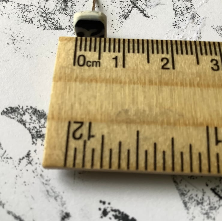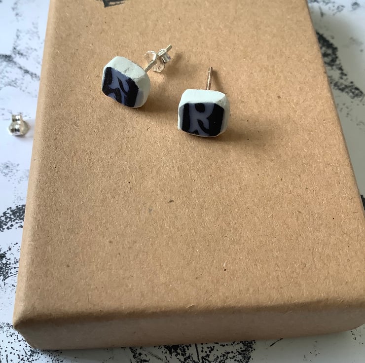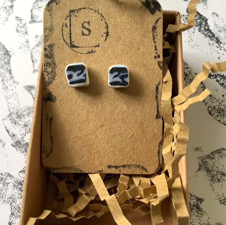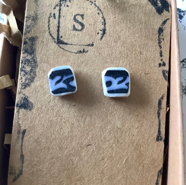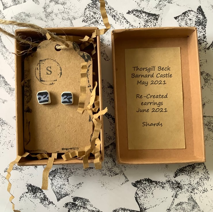 These earrings are made from a rim of a small plate/saucer found under a lump of wood in the beck. The ceramic was long but both ends were very damaged. I managed to save just two small shards and created these blue earrings. I only found this one small piece so these earrings are completely unique.