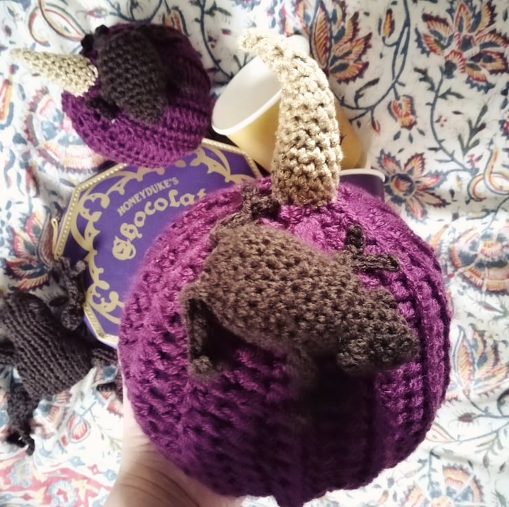 The pumpkins are a lovely deep purple with a chocolate coloured frog and gold stalk.