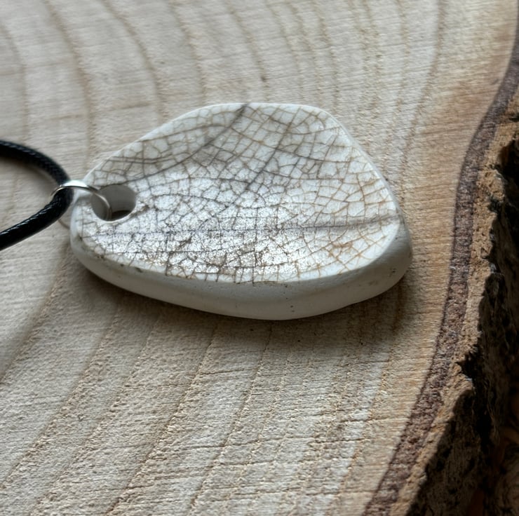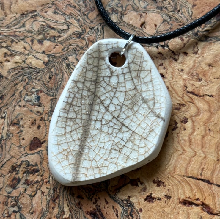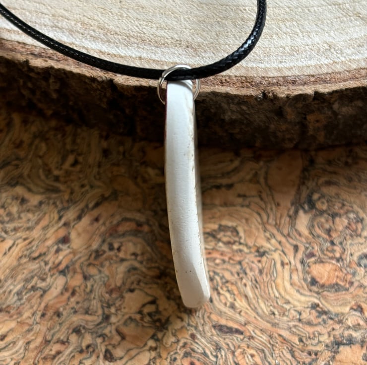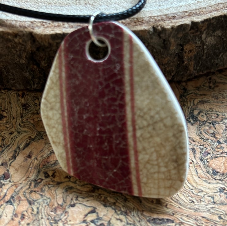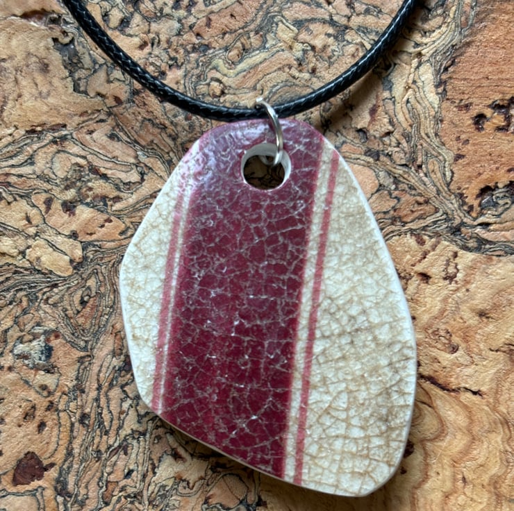 I found a distinctive shard sitting face up in shallow water Abbey Bridge, Barnard Castle. Strong shape, weather and water worn with a lovely burgundy stripe. After a thorough clean I drilled a hole, sanded the sides. I decided to leave the back as found, I love crackle glaze, created through age and journey.