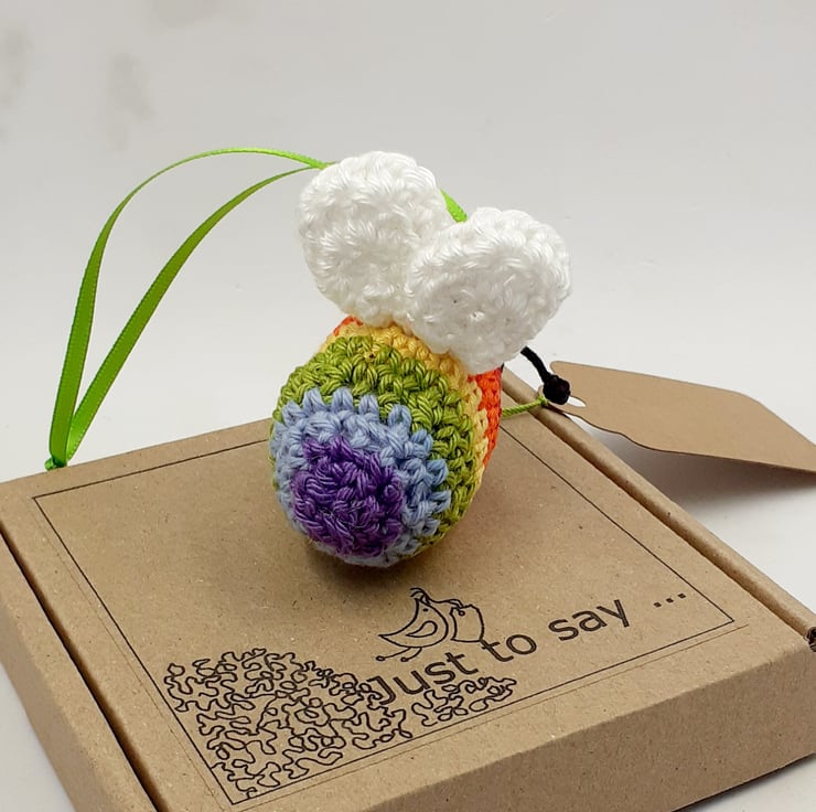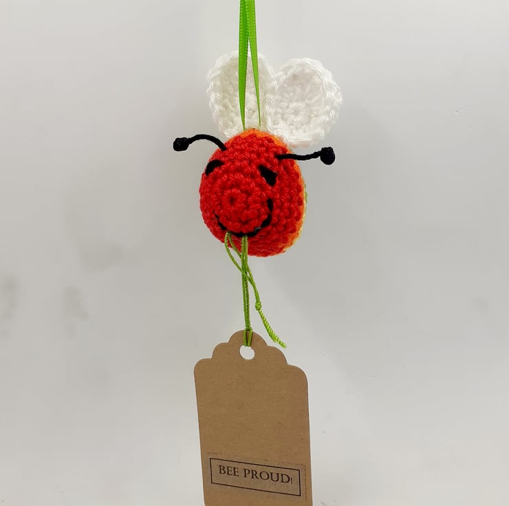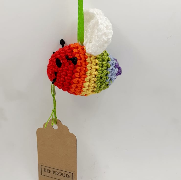 This bright little bee is crocheted in stripes of rainbow coloured cotton. It is filled with polyester stuffing and has a narrow satin ribbon hanging loop. It carries a tag which reads 'Bee Proud!' although I am very happy to exchange this tag for one with wording of your choice.