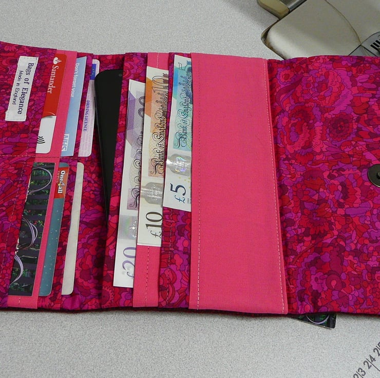 Made from wool tweed and Liberty cotton, this large bi fold wallet features 6 credit card slots, 4 large slots for notes and receipts and a zip pocket on the back for small change. The largest slot will take a mobile phone depending on size of phone.