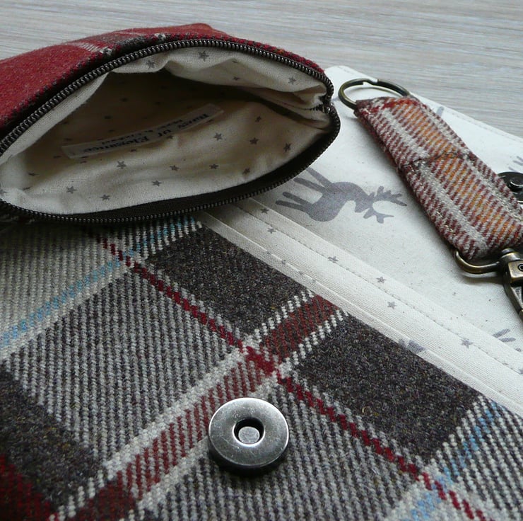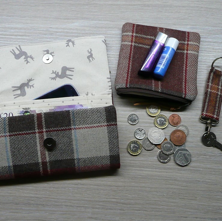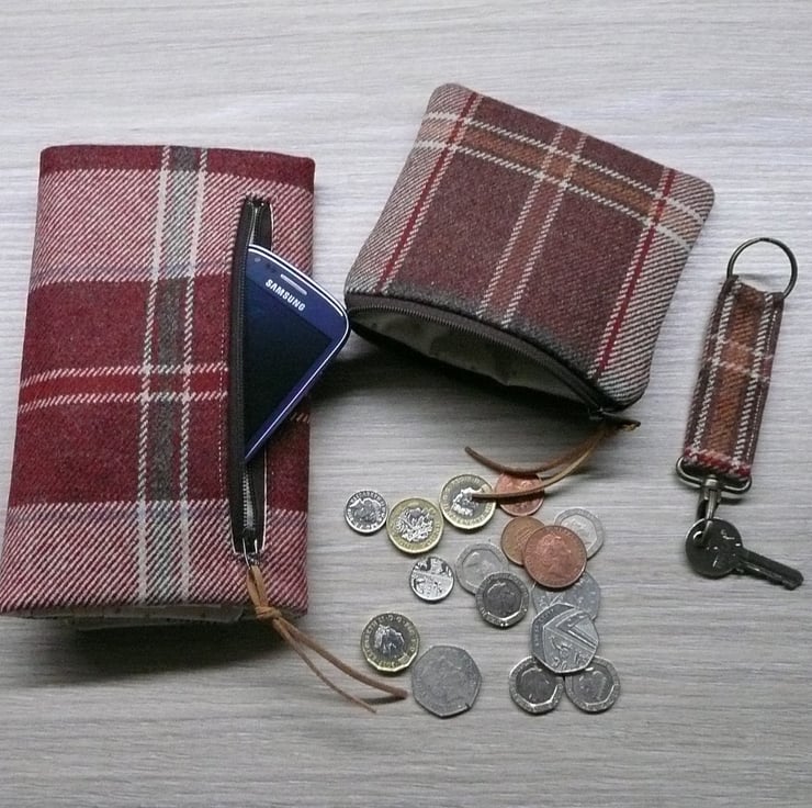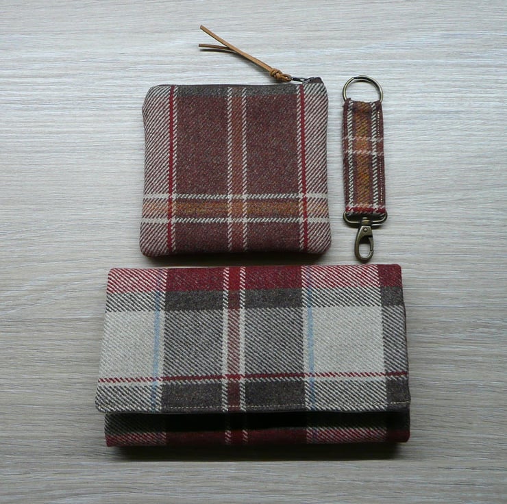 Wool tweed bi fold wallet, coin purse and key ring set made from British wool tweed and quilting cotton