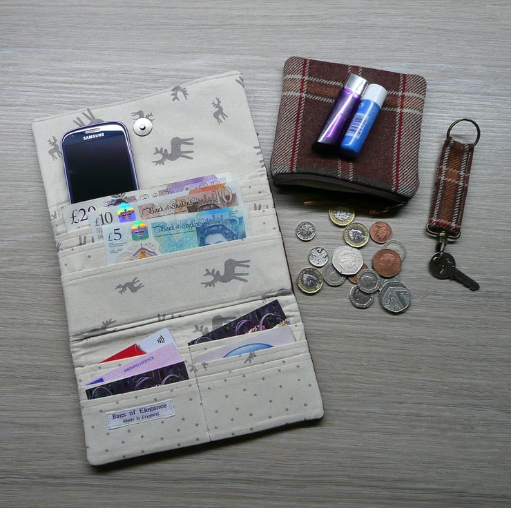 The wallet has 6 x credit card slots, 4 x long slots for notes ( the largest slot will take some mobile phones depending on size ) and a zip pocket for small change. The wallet closes with a strong magnetic snap fastener, the bag hardware on the keyring is in antique brass colour
