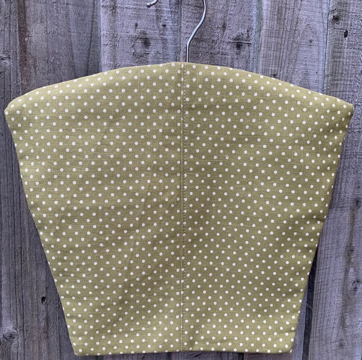 Peg bag made from cute voyage bird cotton and green spotty cotton. Fully lined with reclaimed cream cotton. It hangs from a strong wood and metal hanger.