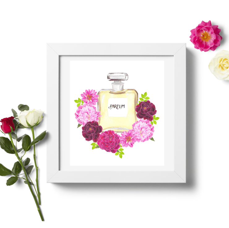 This design was created for anyone who likes girly and feminine styled art and for those with a passion for perfume. I've used a combination of watercolour painting for the bottle together with floral elements created using watercolour and gouache combined, added digitally to create a bright floral art print. I have also hand written the word "Parfum" French for perfume and added this to the piece digitally.