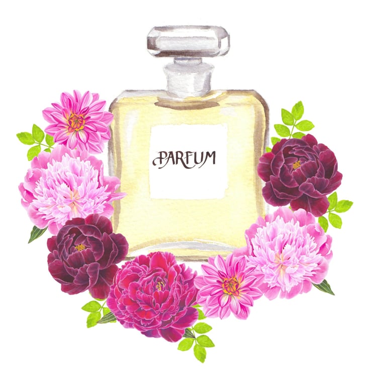 A4 open edition digital print of a large perfume bottle surrounded by flowers
