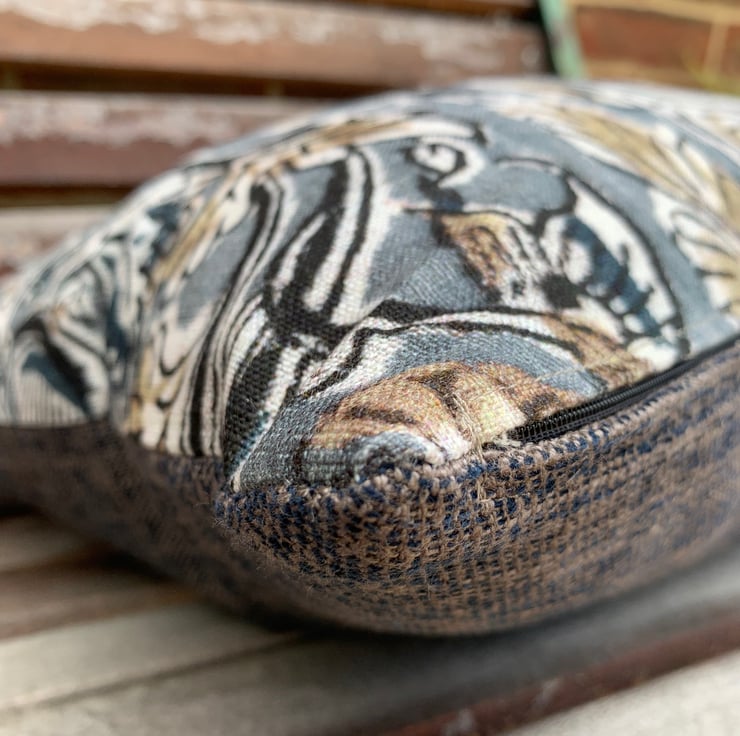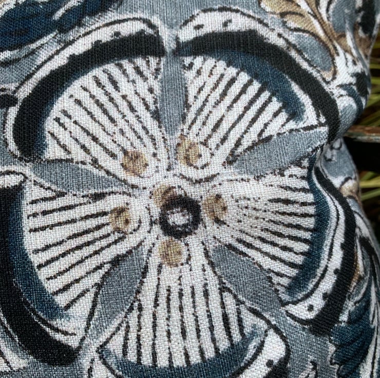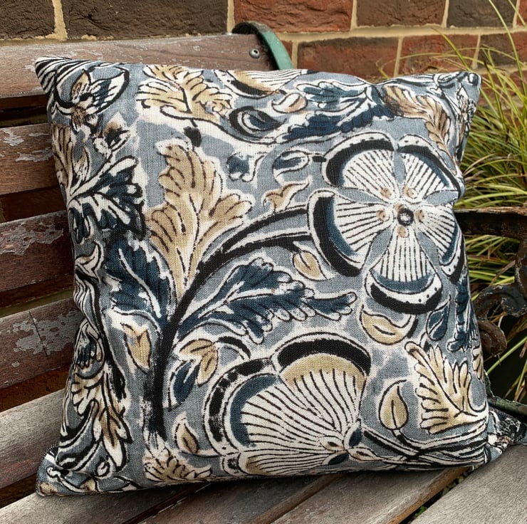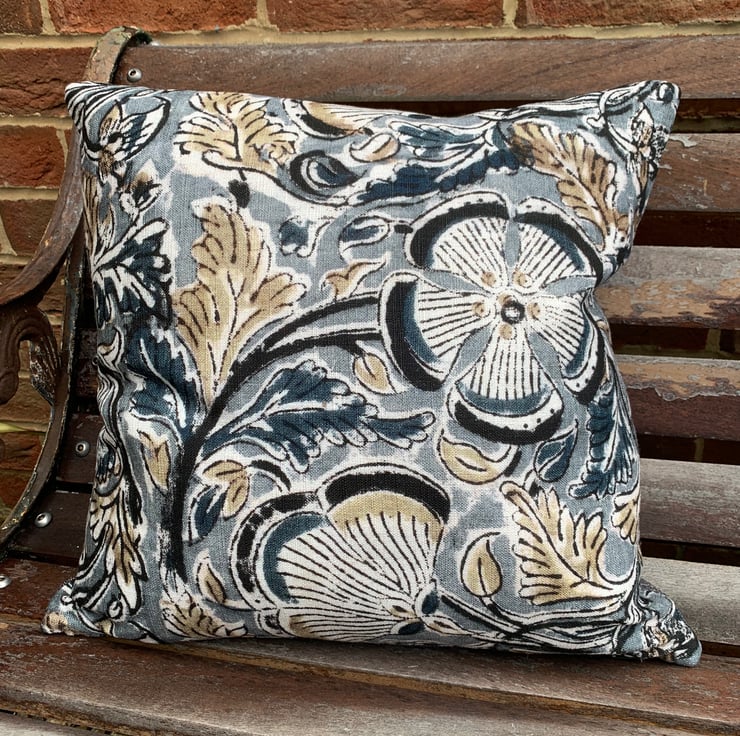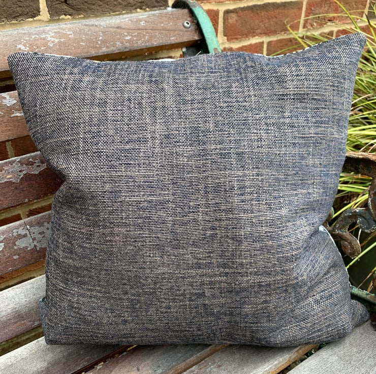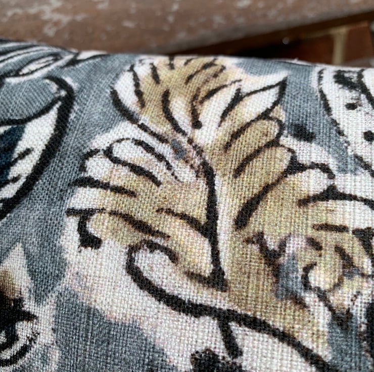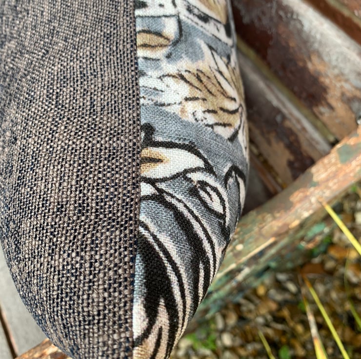 Striking cushion cover in William Yeoward Kalamos linen-viscose fabric in the slate colourway. It is backed with a thick slate and brown woven fabric.