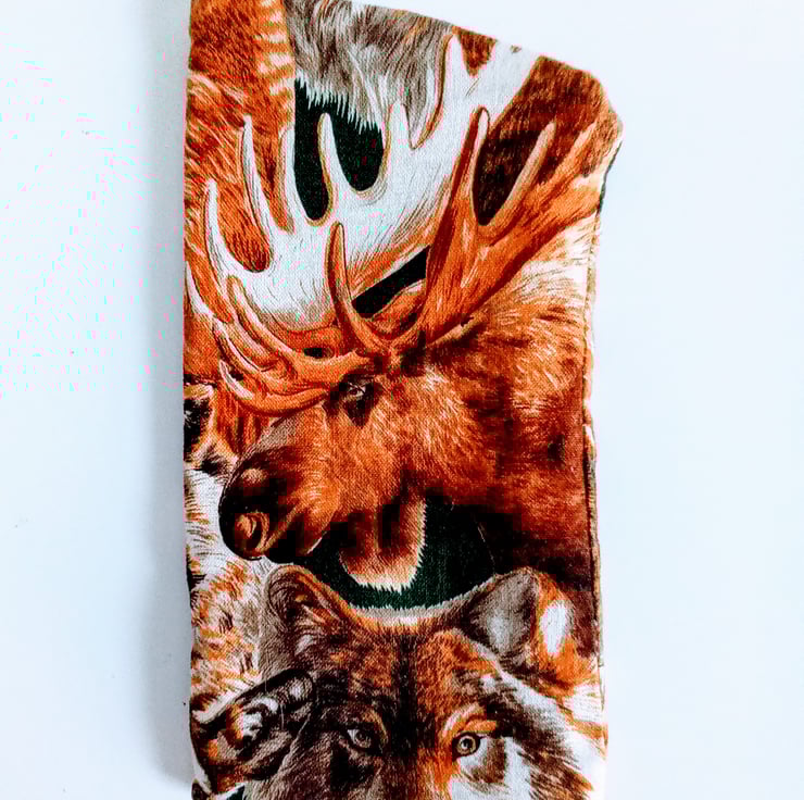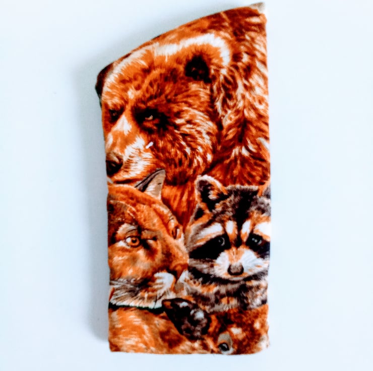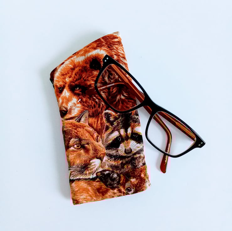 This is a fun glasses case with brown felt lining and a small plastic popper to keep it closed.
