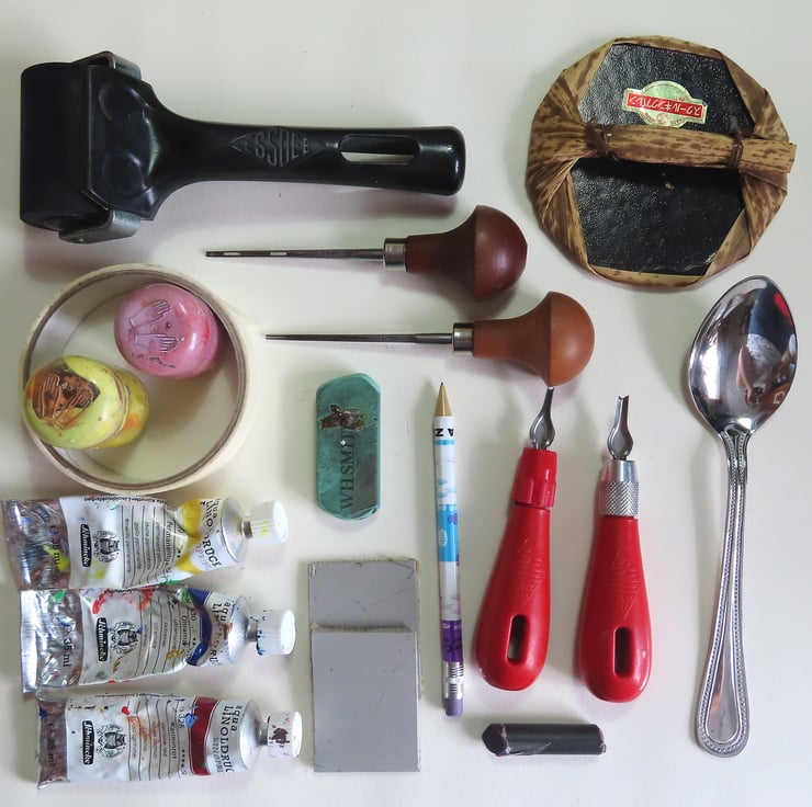 The artwork is printed in Schmincke Aqua Linoldruck Linoprint Ink (Water Based) on Winsor & Newton Smooth Grain Cartridge Paper (220gsm).