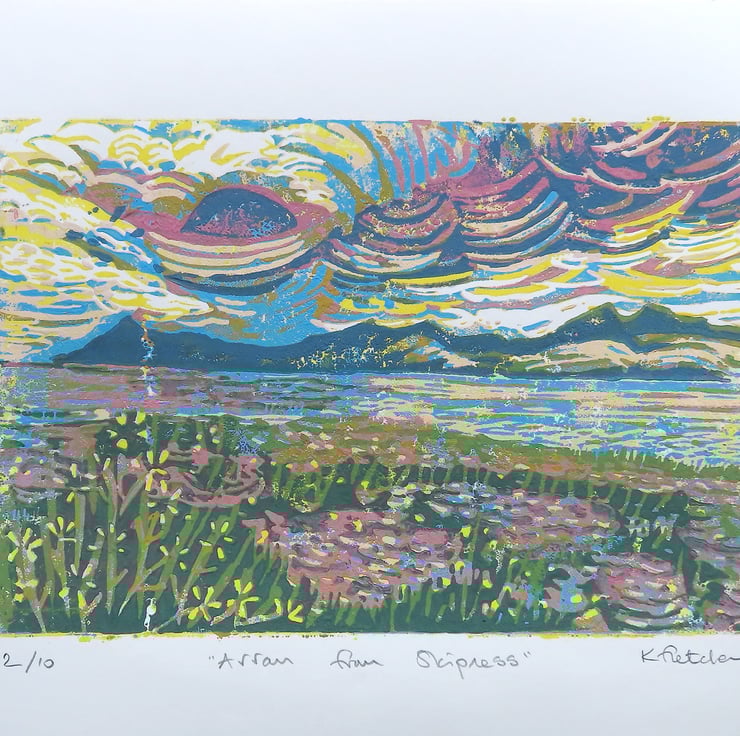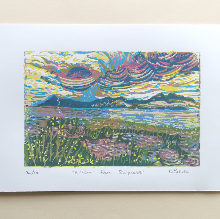This is an original hand pressed reduction linocut print of the Scottish island of Arran viewed from the shingle beach at the village of Skipness, Kintyre, on the Scottish mainland. It is based on photographs I took during a visit to the area some years ago.