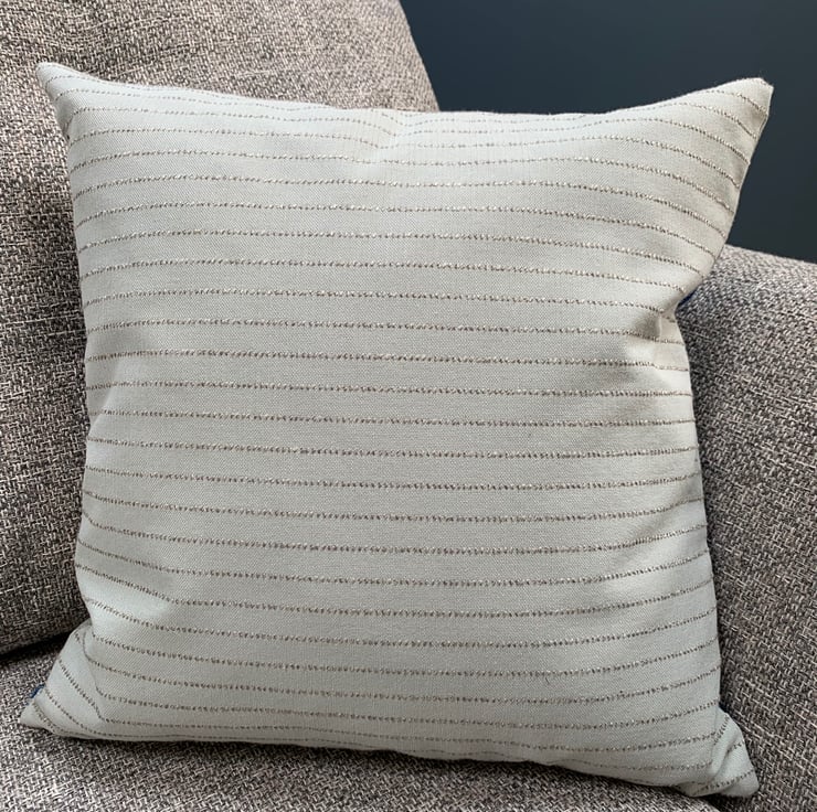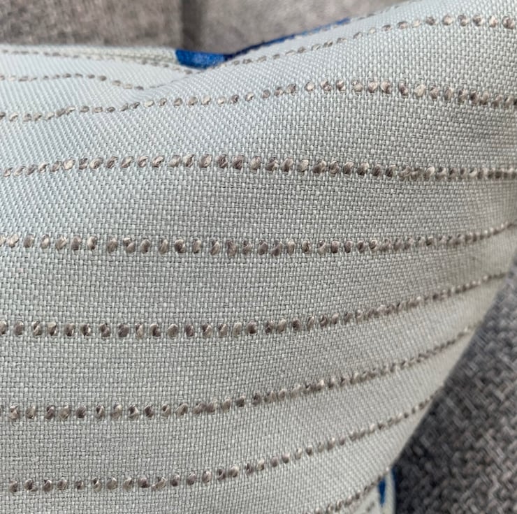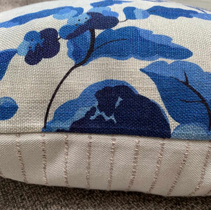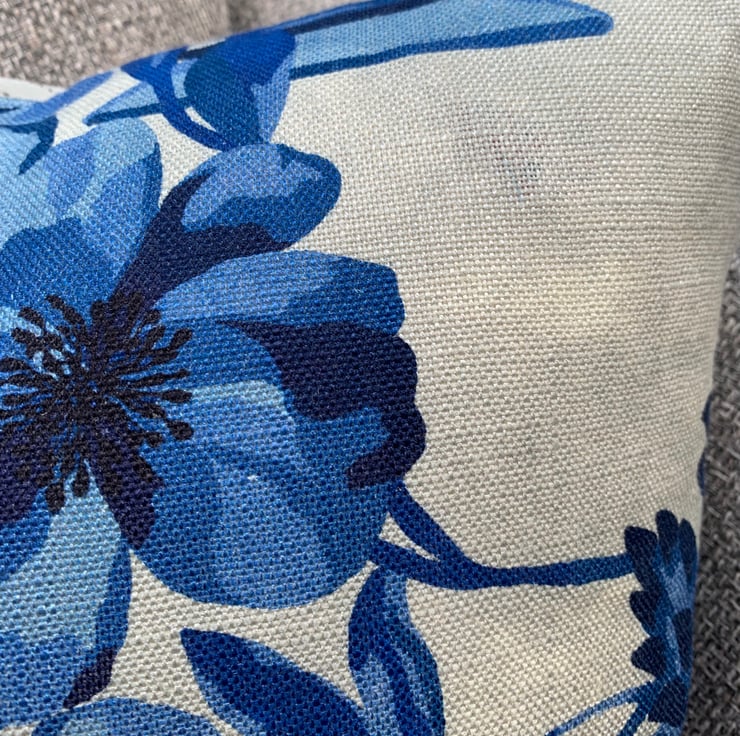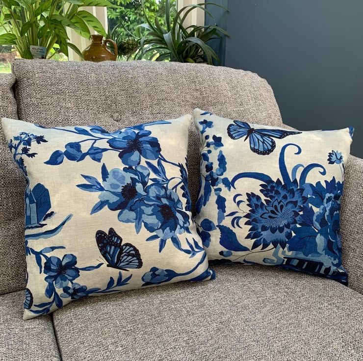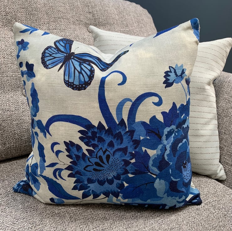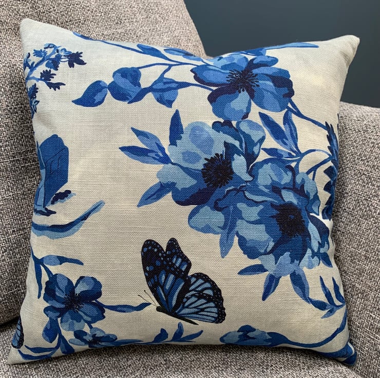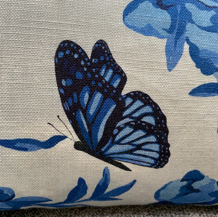 Beautiful cushion cover in butterfly garden linen-mix fabric in deep blues on a mottled pale grey background. It is backed with a thick pale blue cotton mix fabric with a textured pinstripe.