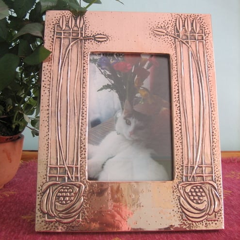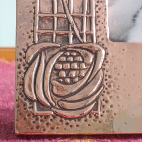 This frame has been hand-made in copper in the Arts and Crafts tradition. The design comprises elements of the work of Charles Rennie Mackintosh, and the copper has been patinated and polished to give a rich antiqued finish.It measures 195 x 245mm overall and takes a 120 x150mm photo