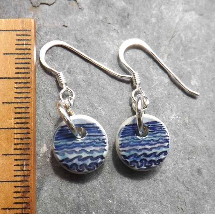 These dainty earrings have a design of waves pressed into the wet clay, which have been painted different shades of blue and turquoise.