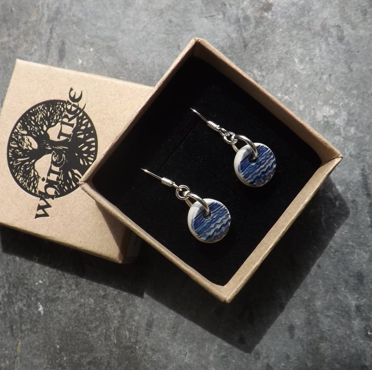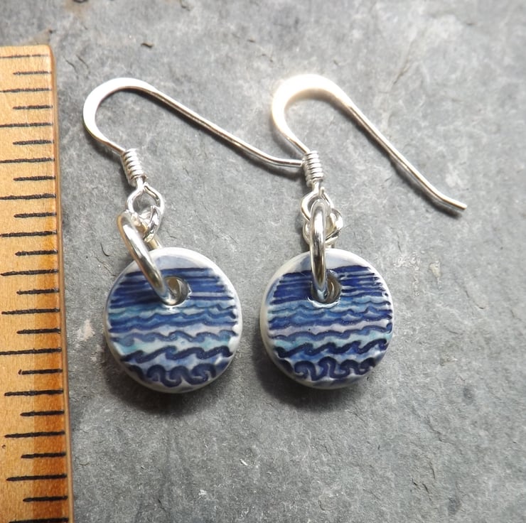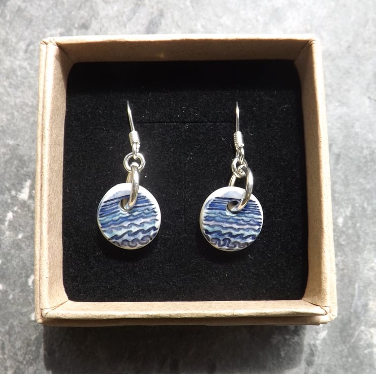 These dainty earrings have a design of waves pressed into the wet clay, which have been painted different shades of blue and turquoise.