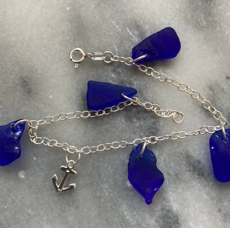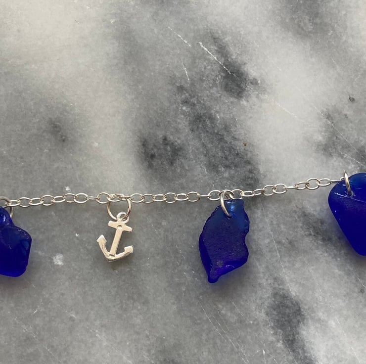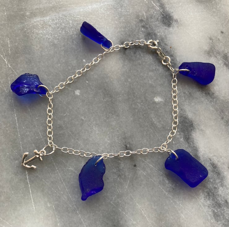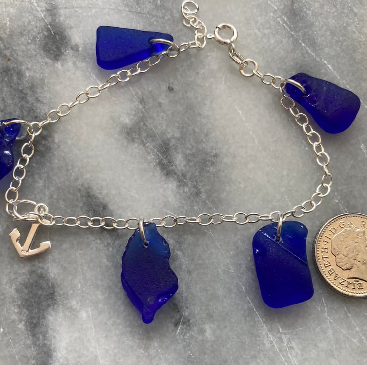 Sterling silver chain bracelet, 7.5in, has a Sterling silver anchor charm with 5 pieces of cobalt blue seaglass, all approx size of a 5p piece, to complete a striking and unique piece of jewellery.