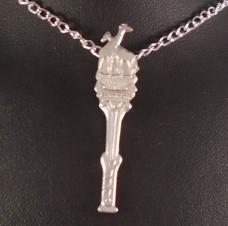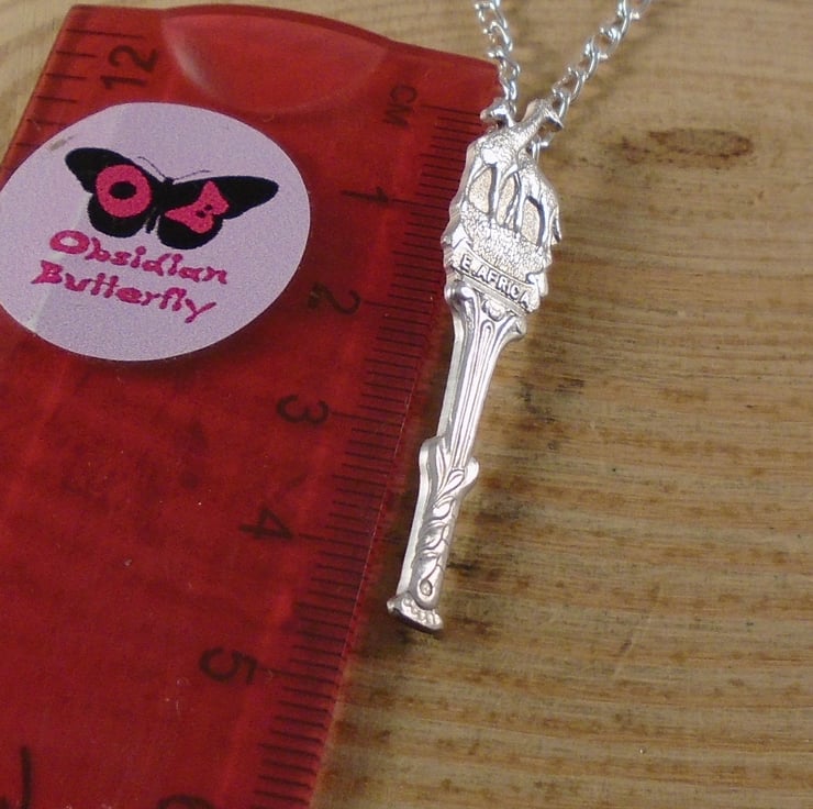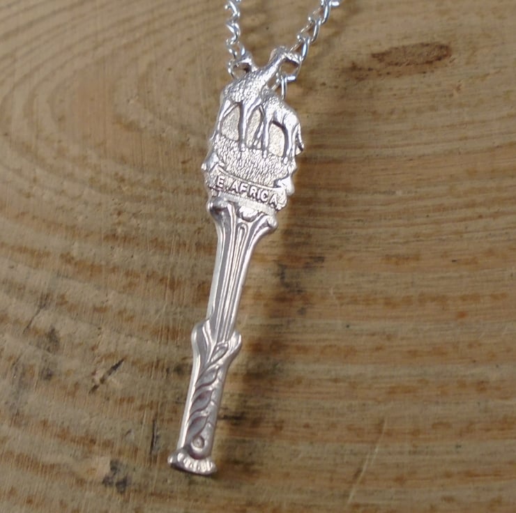 An unusual, one of a kind necklace, hand made from an old silver plated teaspoon from East Africa. The bowl of the spoon has been sawn off, and a sterling silver loop has been soldered to the back of the spoon handle for the chain. The handle features two giraffes and the words 'E. Africa'
