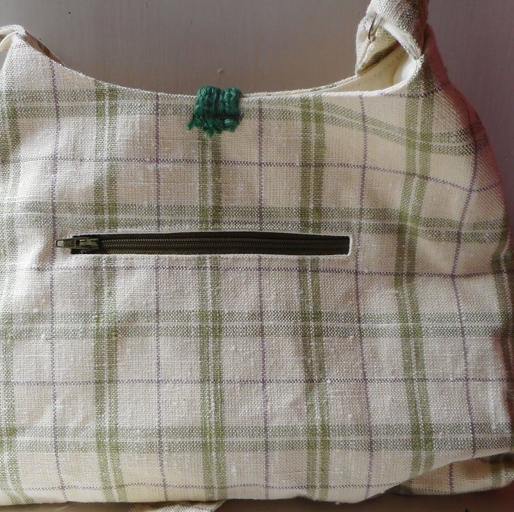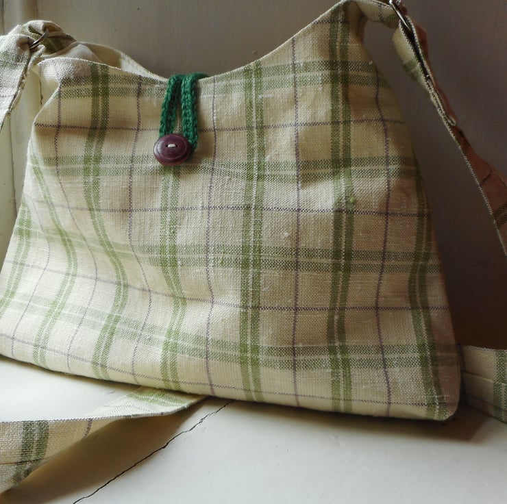 Checked linen fabric bag in a triangular shape with purple wood button and crochet loop fastening.