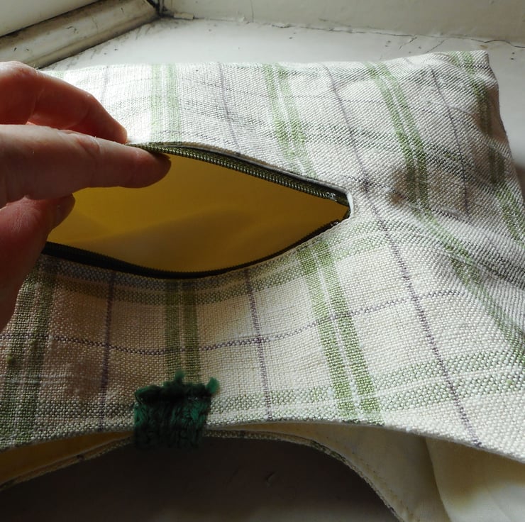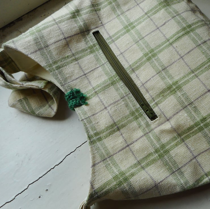Fabric is a furnishing fabric remnant. I don’t know the fibre content but it has a high percentage of linen by the feel of it. This fabric has a cream base intersected by checks in a beautiful sage green and a misty lilac.