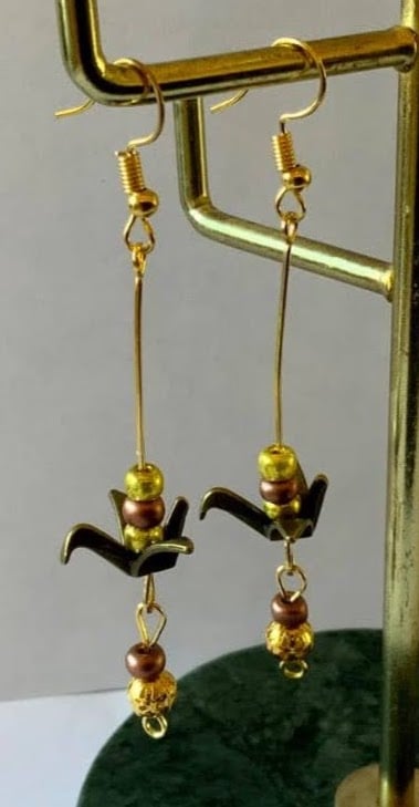 Featuring Three mini rochelle beads in light gold and copper within the centre of the metal copper crane bird.