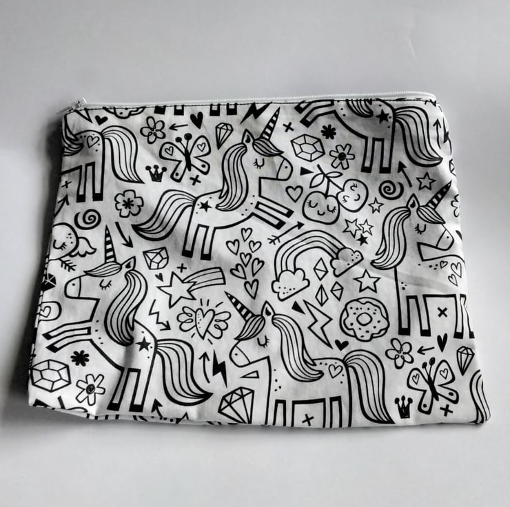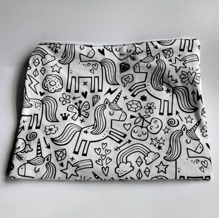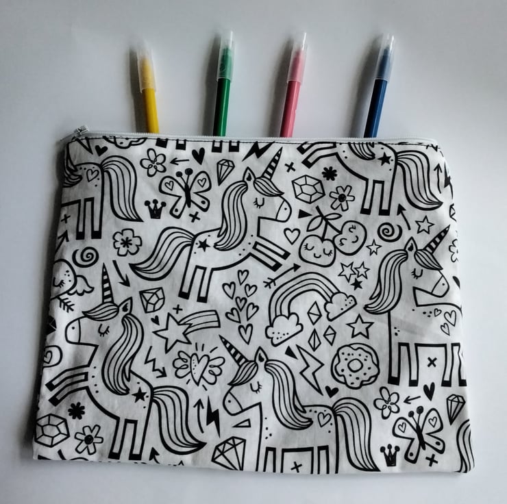 This is a pencil case that you can colour in yourself to make it an individual design. The pencil case measures approximately 25cm/ 10inches in length and is approximately 20cm/ 8inches deep. The pencil case has been lined with a black cotton fabric.