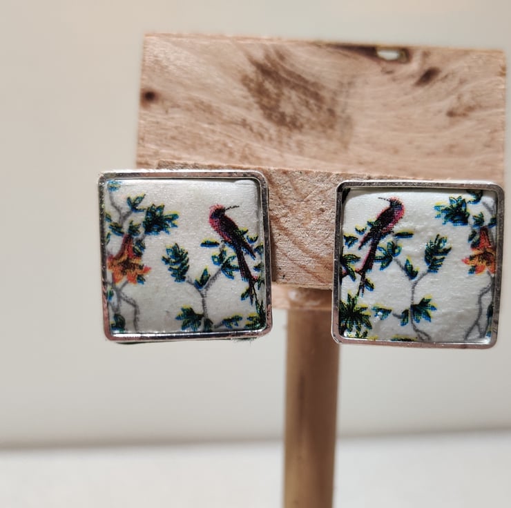 Hand made polymer clay earrings with a jungle pattern. A silver colour embellishment has been embedded into the clay to give a boarder. It does not fit 100% flush into the clay. Also there is a faint line across the top of one earring (pencil mark) Stud fixing which can be painted with hypoallergenic coating on request for free. Please see all photos for close up detail. All products handmade therefore there may be minor imperfections. Each pair sold as seen, message for more