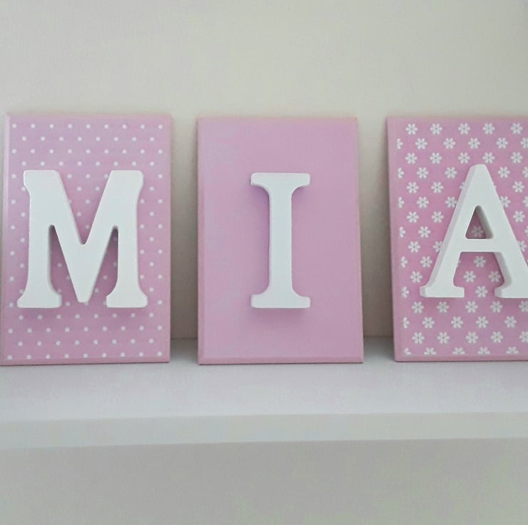 My plaques have sanded rounded corners, are handpainted with added decorative papers and raised wooden painted white shabby chic letter on each plaque, finished with satin ribbon for hanging. Or command strips to avoid wall damage.
