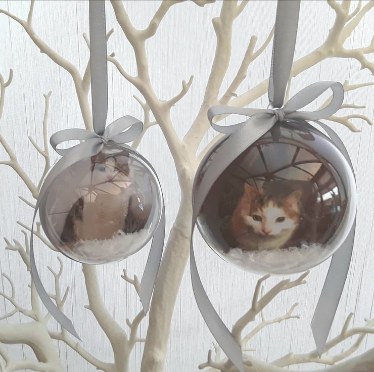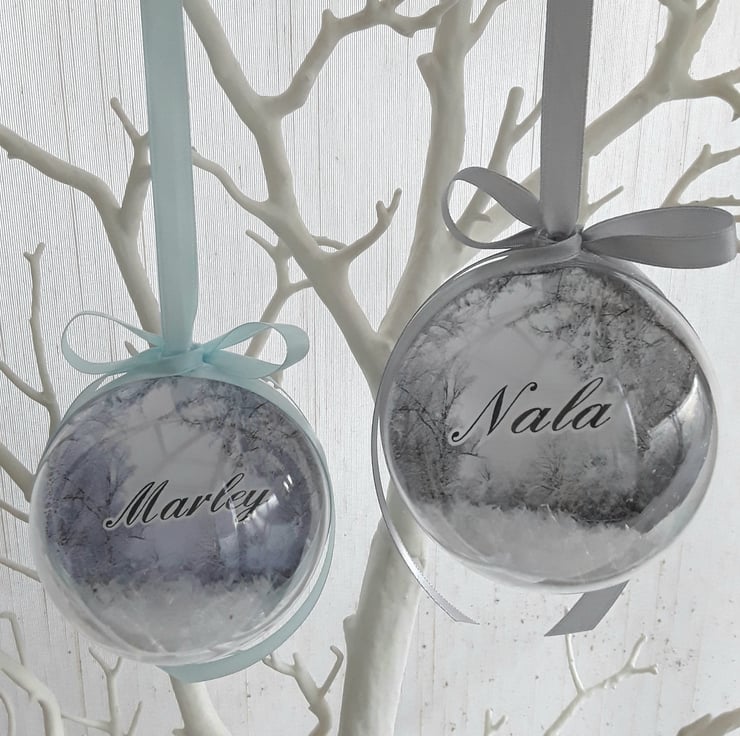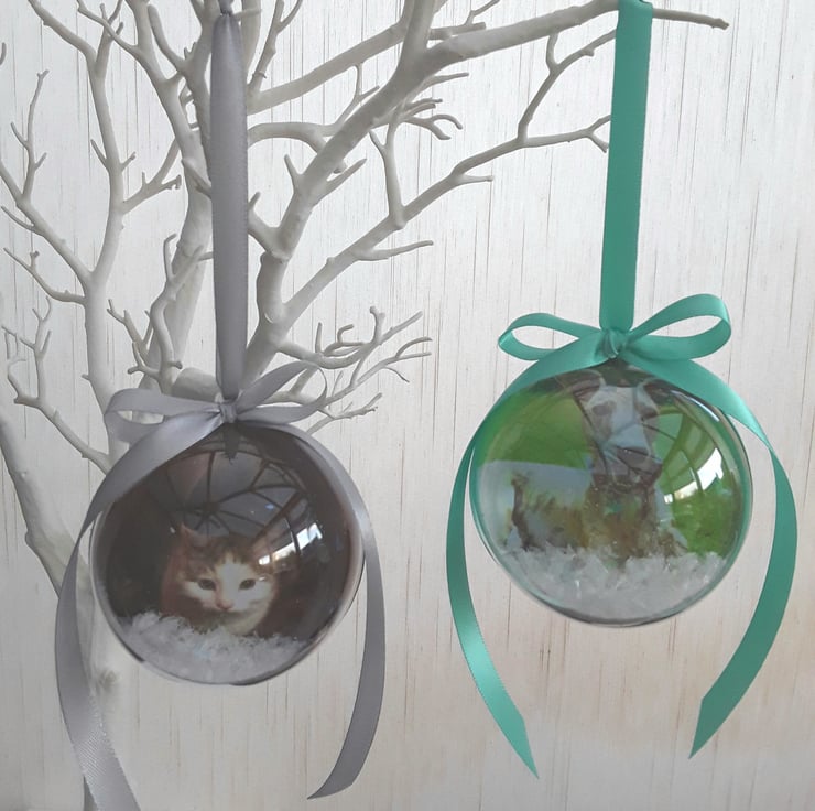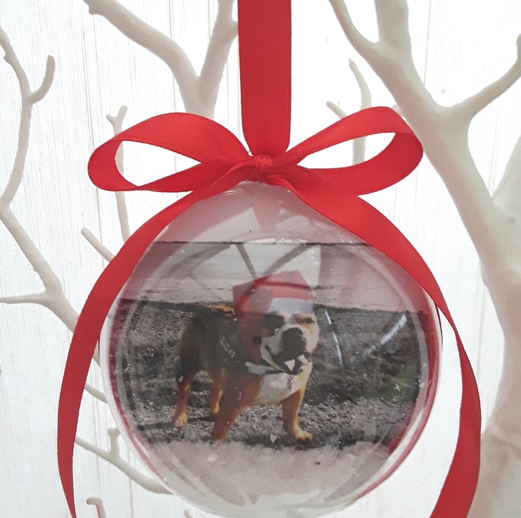 Your chosen picture and message in bauble, artificial snow inside bauble, and tied with coloured satin ribbon colour of your choice for hanging.