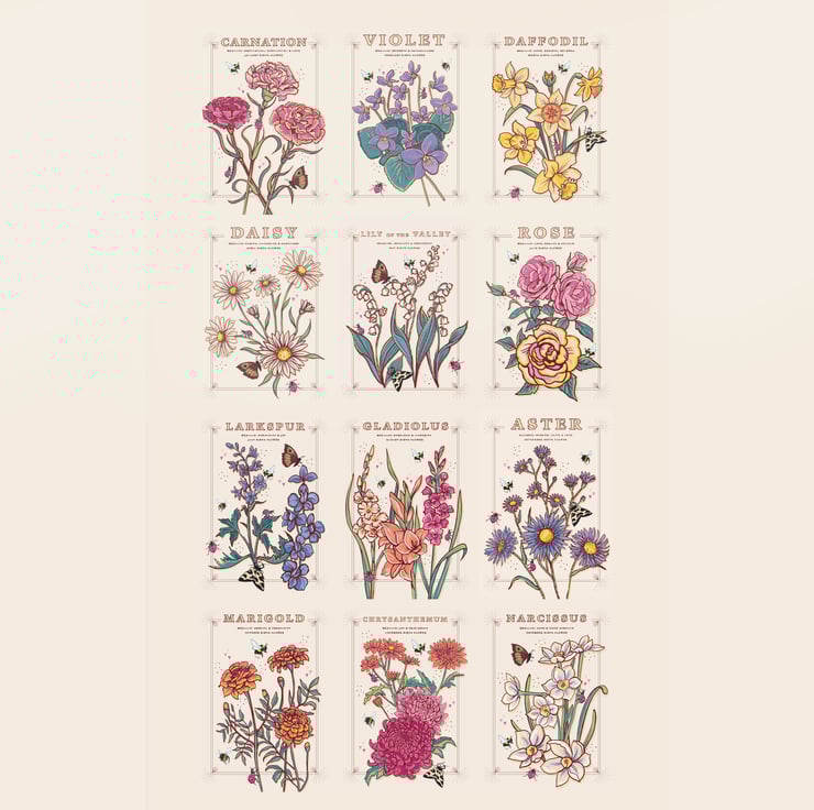 The top section of the page features my original, botanical, line drawn illustration of the month's birth flower stating the meaning of each flower.