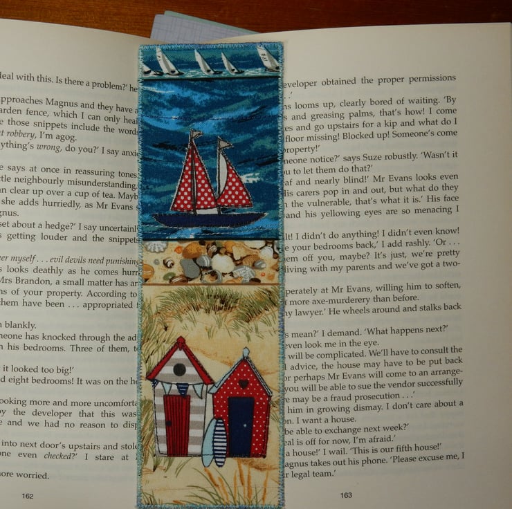 This fun bookmark features two beach huts in the foreground on the dunes, with surfboards at the ready. A yacht sails by, with further boats in the distance. This bookmark measures 2.5 x 8 inches. It is made from seascape themed fabrics, with the the additional features appliqued on. The edge is stitched in matching blue thread.