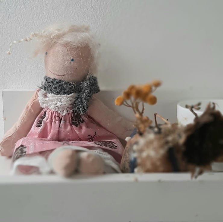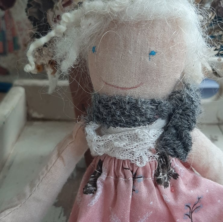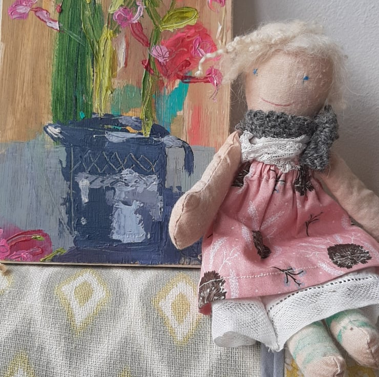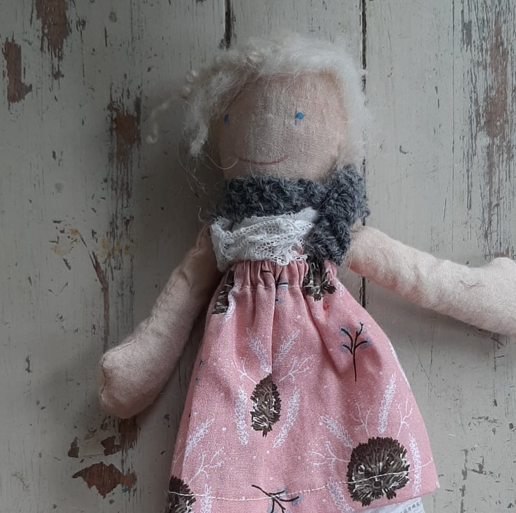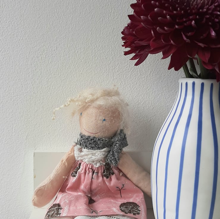 'Hettie hedgerow 'To fit in your pocket and take on adventures. This sweet pocket rag doll is just 19 cm tall .she is soft and her skin is dyed with avocado stones to give a soft pink. With a new pettiecoat and a hand knitted scarf.